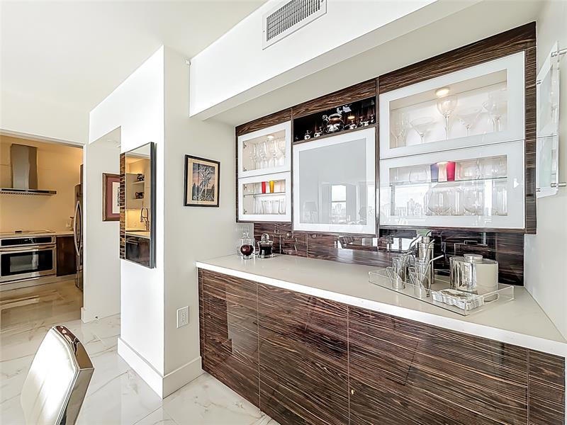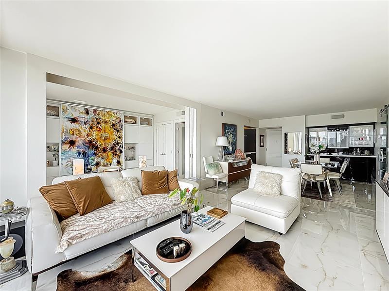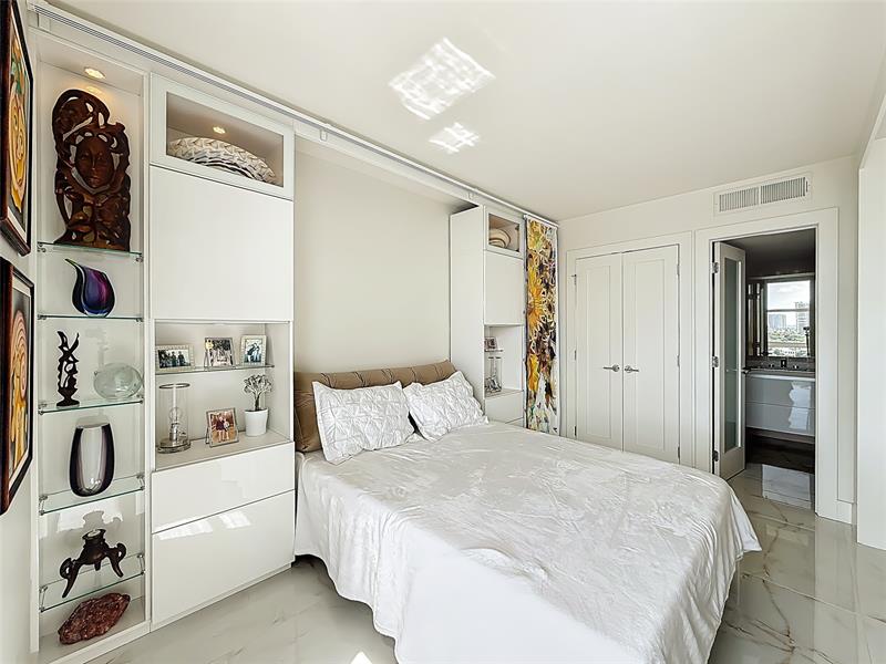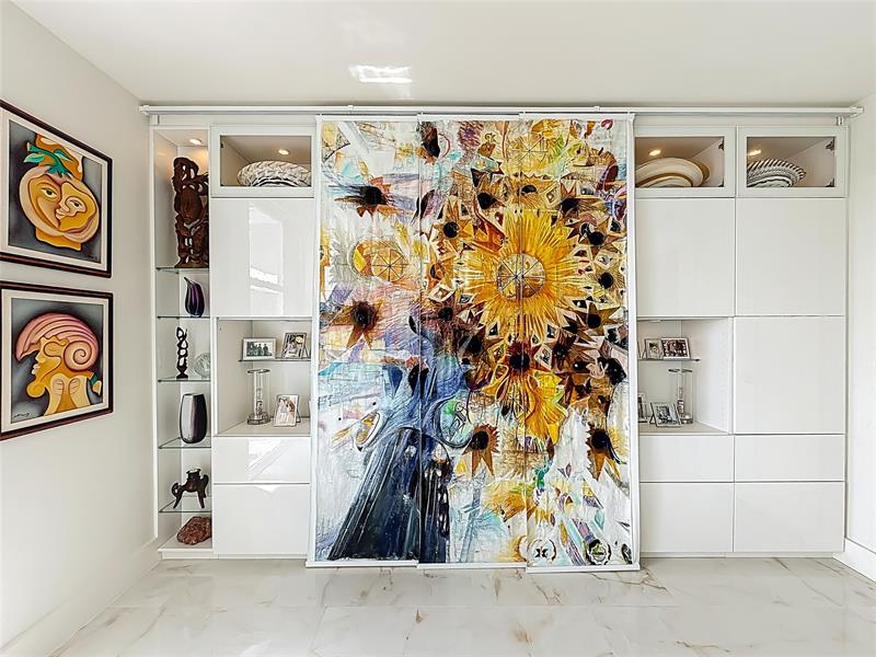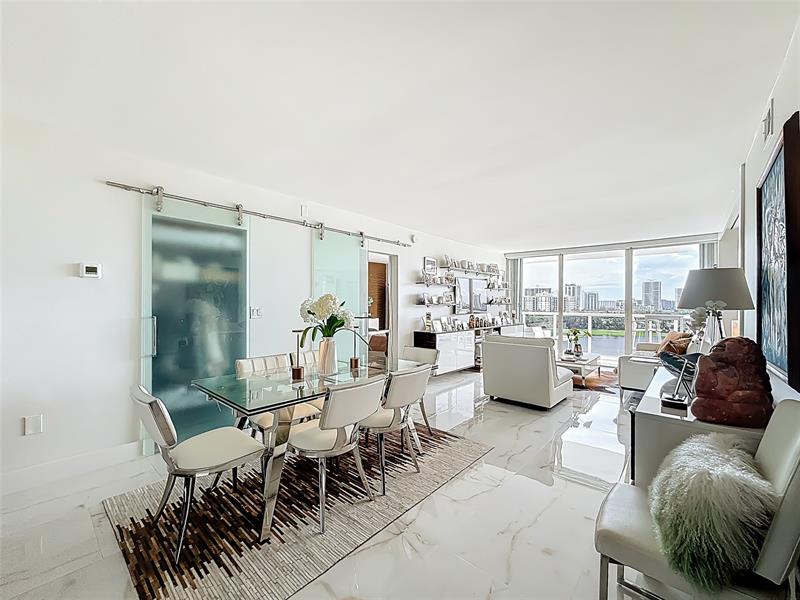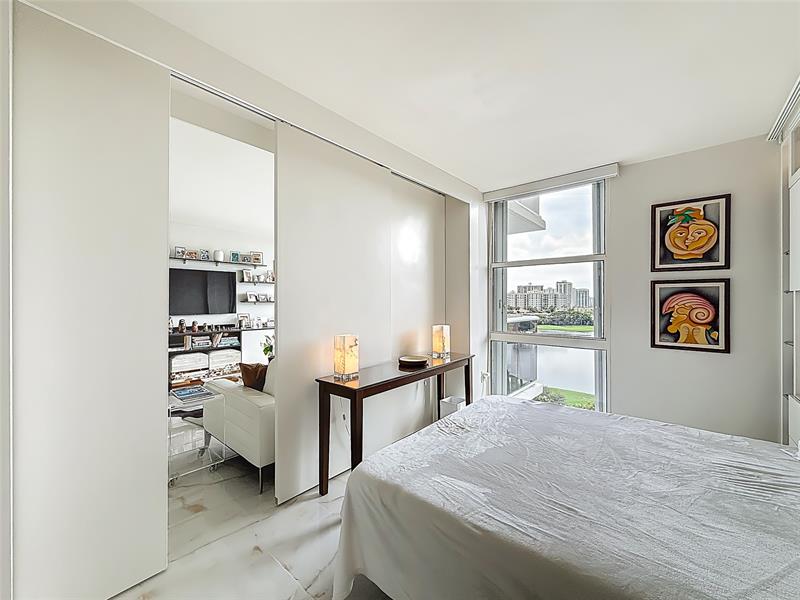 Architect’s residence with turnkey fully furnished option. 180-degree views of sunrises over the ocean, majestic sunsets, shimmering moonrises & serene lake reflections. Innovative living area seamlessly integrates the LR, DR & 2nd BR for open concept, but can be portioned into an office/bedroom w/ a panel pocket wall system. Artfully concealed Murphy bed creates a BR w/ closet & en-suite bathroom. Interior features: 3D accent walls, exquisite mother of pearl tile, custom kitchen, bar w/ built-in cabinets, entertainment center w/ floating shelves, motorized blackout shades, WIC, lots of storage, hurricane shutters & deeded parking (2nd available). Location is on the Soffer nature trail & Turnberry lakes…Walk to Aventura mall, restaurants, houses of worship, dog park, horse track