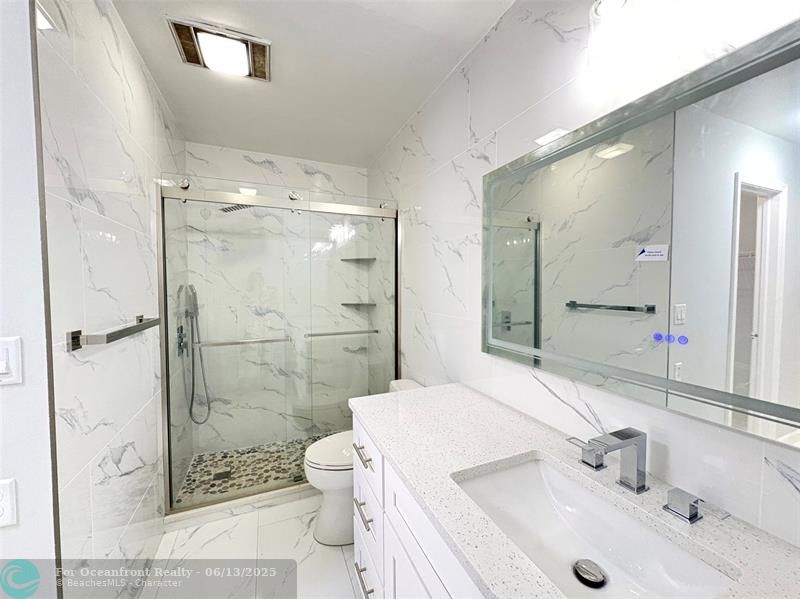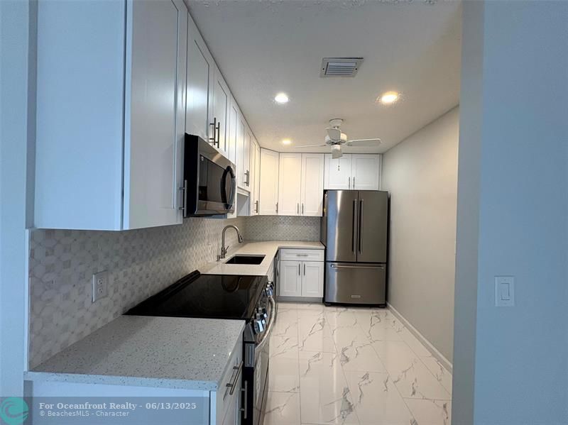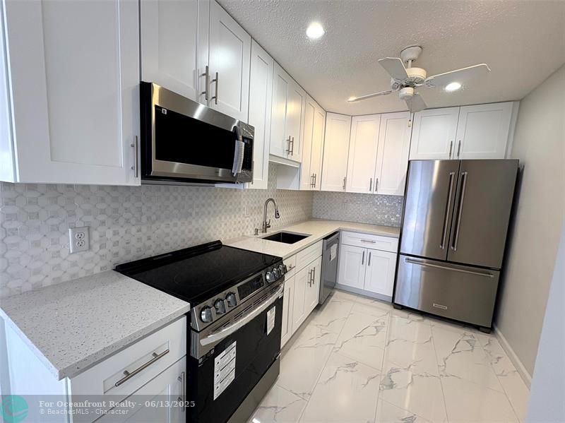 TOTALLY RENOVATED with MODERN DESIGNS! This beautiful & spacious 2 bedrooms & 2 Full baths locates the heart of Boynton Beach. Brand new classic white porcelain tiles Flooring throughout the unit. Brand new KITCHEN with white Shaker wood cabinets, quartz countertops, marble backflash, stainless steel appliances; and Kitchen Aid Refrigerator. There is a private patio/Florida sunroom or an in-door garden or whatever you want it to be. New washer & dryer in the Garage (1-car) with plenty of storage space. Only a few units come with 1-car garage in this complex. Clubhouse features Pools, Fitness room, Tennis, Pickleball, Bocce ball courts, shuffle board and lots more other activities. GREAT LOCATION! A few minutes to shops and restaurants; and only 4 minutes drive to beaches.
