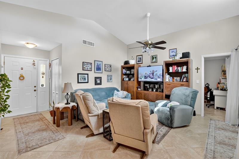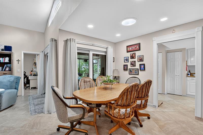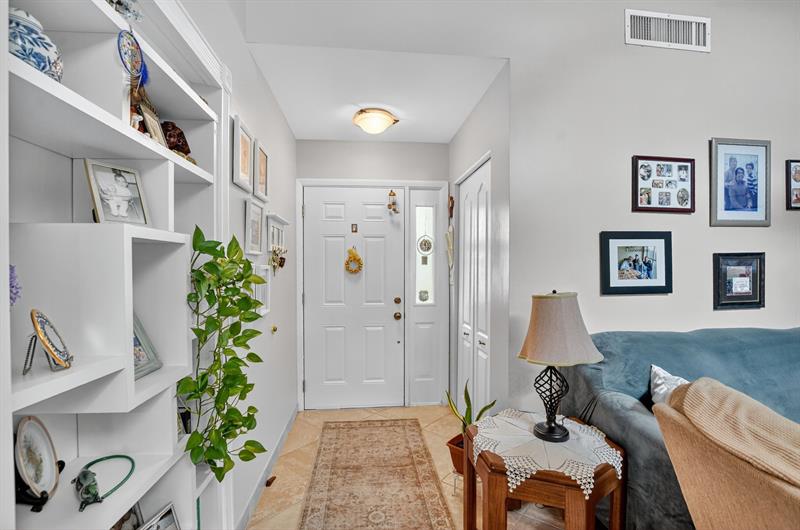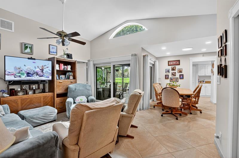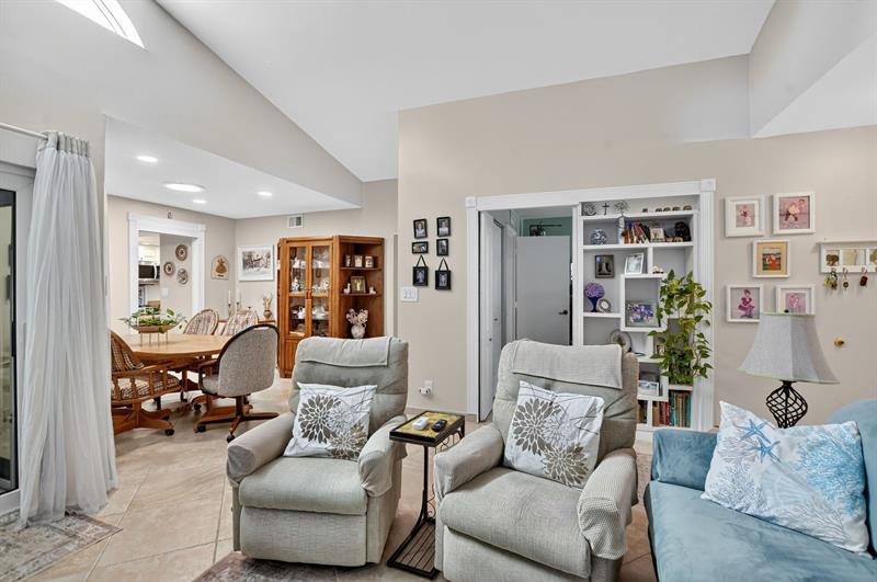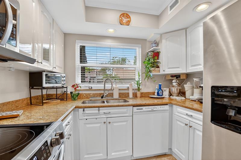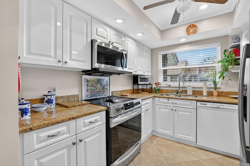 This beautifully updated 2-bedroom, 2-bathroom villa is ready for you to call home. Natural light pours in through new impact windows and sliders, providing peace of mind and energy efficiency. The kitchen is a chef's delight with newer stainless steel appliances, including a refrigerator, range, and microwave, perfect for preparing meals and entertaining guests.