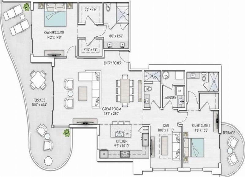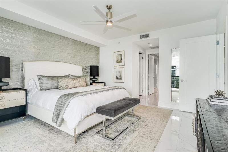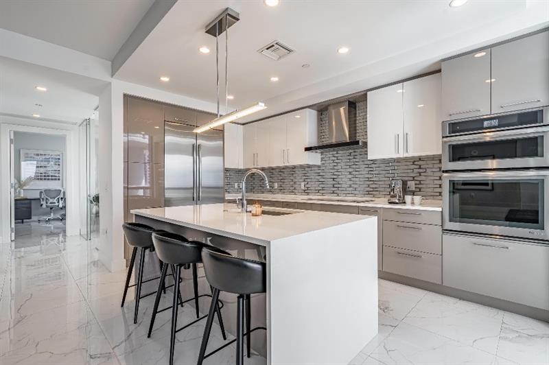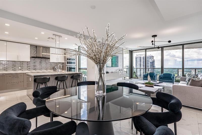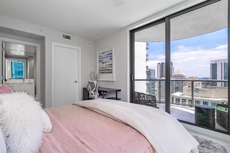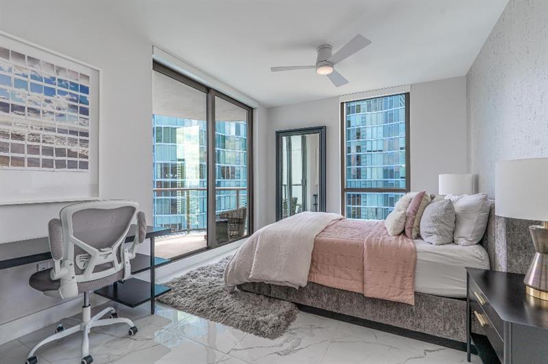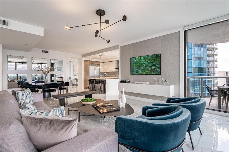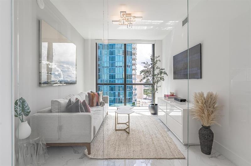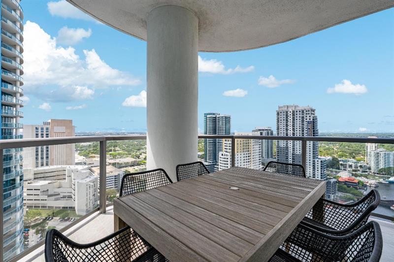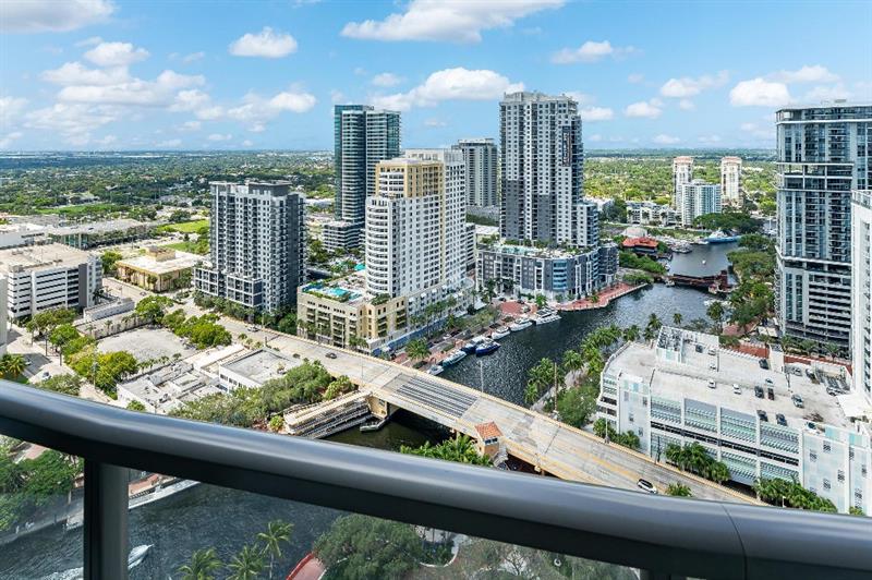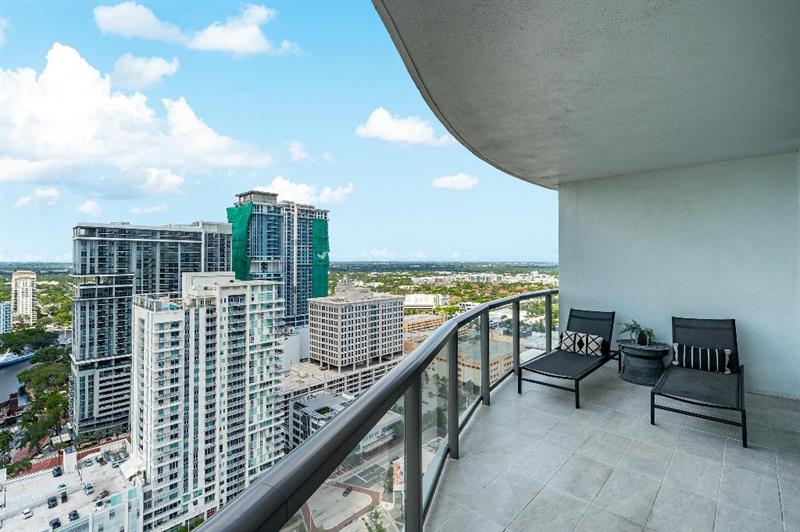 Sophisticated 30th floor residence in the premier 100 Las Olas tower, offering exceptional river, city, and skyline views from every room. This 2-bedroom + den, 3-bath layout is one of the building’s most desirable floor plans, featuring 9’ floor-to-ceiling windows and an expansive 550 sq ft wraparound terrace. Interior upgrades include porcelain tile flooring, quartz countertops, motorized blinds, custom closets, designer lighting, and built-ins. The flexible den functions as an office or optional 3rd bedroom. Two premium side-by-side EV-ready parking spaces included. Enjoy full-service luxury living with high-end amenities and immediate access to the dining, shopping, and energy of Las Olas.