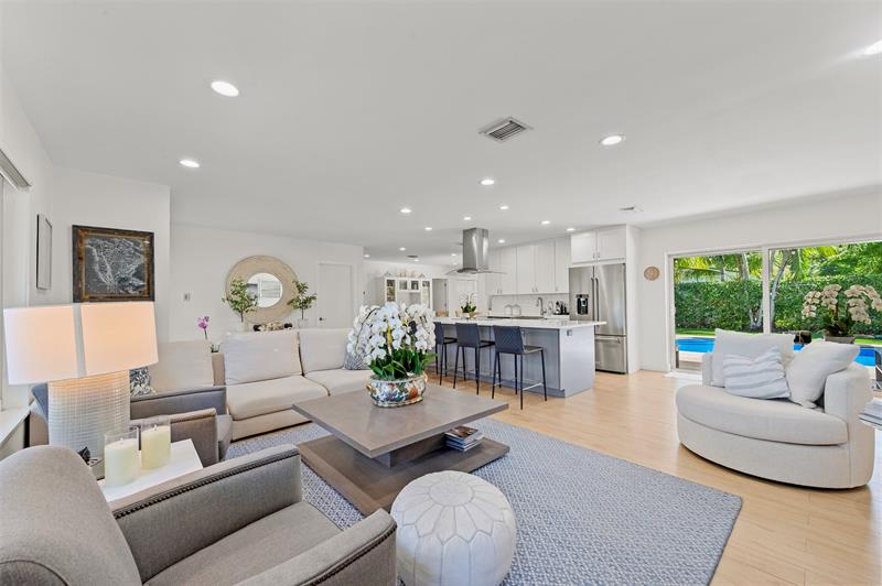 This exquisite 4-bedroom, 3-bath pool home w/2 car Garage has been completely reimagined with high-end finishes & modern sophistication.  Nestled in one of Fort Lauderdale’s most coveted neighborhoods, the home effortlessly blends contemporary design with the warmth of relaxed coastal living. An open, sun-filled floor plan creates a seamless flow for both everyday living & stylish entertaining. The chef’s kitchen, elegant living spaces, and thoughtfully designed interiors reflect comfort and refinement at every turn. Step outside to your private tropical oasis-featuring a covered lanai, sparkling saltwater pool, travertine pavers, & a fully turfed backyard designed for year-round enjoyment and effortless maintenance. Every detail has been beautifully updated-inside and out.
