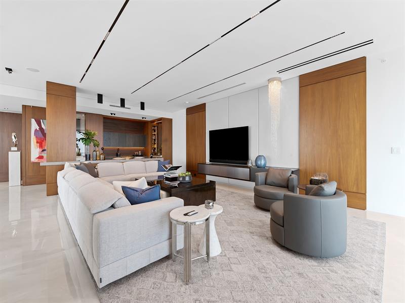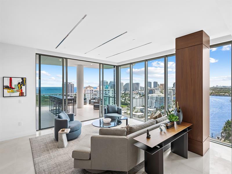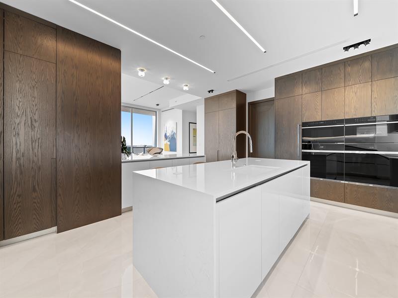 ocean, Intracoastal waterway & city skyline through floor to ceiling walls of glass that invite an abundance of natural light over the open floor plan & multiple living spaces. Striking architectural details, curated finishes & state of-the art lighting provide a sophisticated lifestyle. Expansive terraces with a summer kitchen extend interior living & entertainment areas into the sky. The epicurean kitchen with an abundance of cabinets & upgraded appliances will inspire those who entertain & cook. The primary suite boasts the ultimate retreat: a custom walk-in closet & spa inspired bathrm. Control 4 technology, turnkey/fully furnished, 3parking spaces & add'l storage. Sqft from BCPA