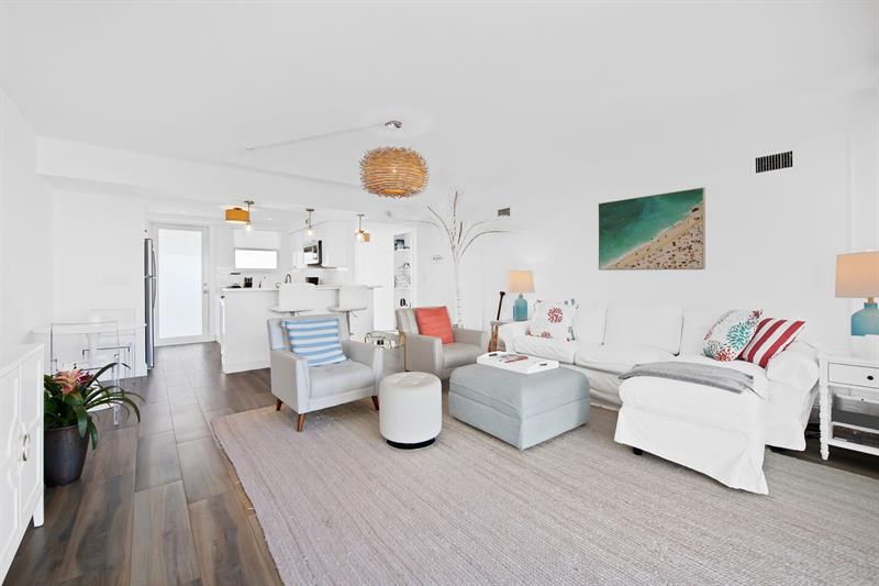 Incredible value for this gorgeous renovated 2 bed 2 bath apartment with ocean views and across from the beach. Walk with your chair along the short path to the beach and absorb the tranquility and sunshine. Completely renovated kitchen with quartzite counter tops and all brand new appliances. Bathrooms have new vanities and still retain their 50's retro charm. Blackout shades in both bedrooms, new A/C and full impact windows. Just bring your tooth brush - this unit will go FAST! Building is financially and structurally sound with completed and paid concrete restoration, ELSS and 40-yr inspection. The amenities include heated pool, fitness center, community room and 24/7 doorman. Low HOA.