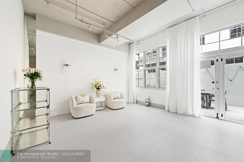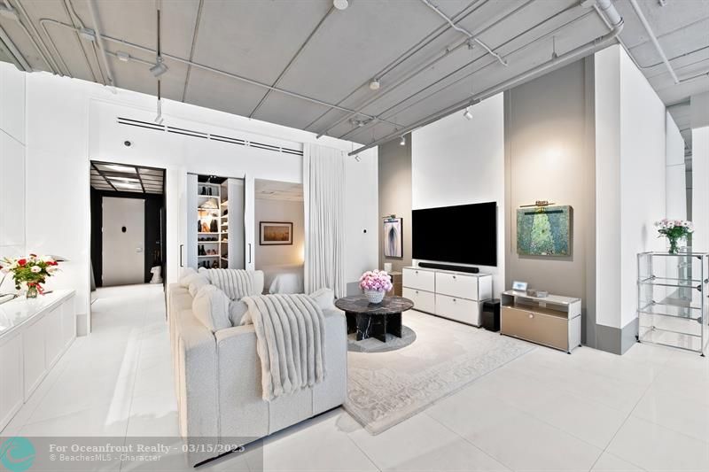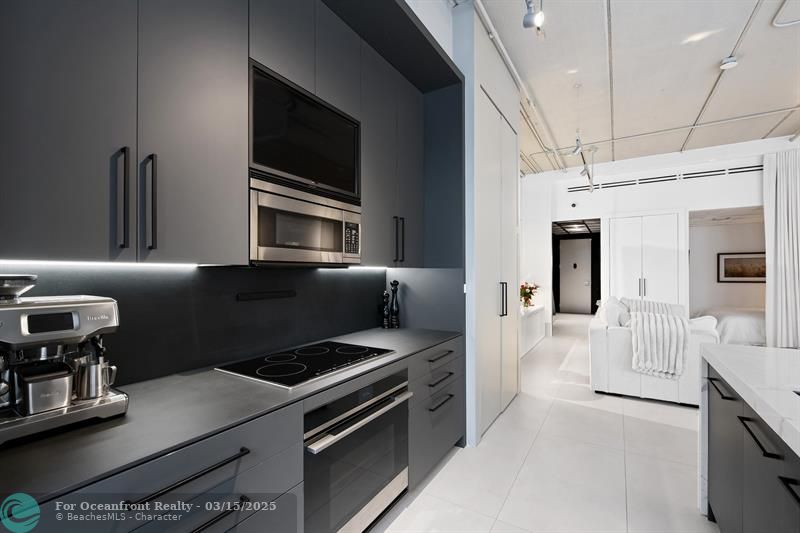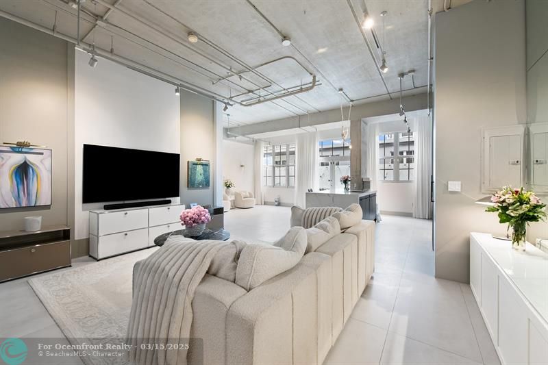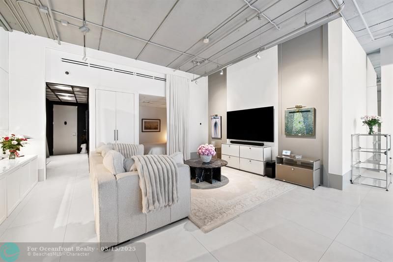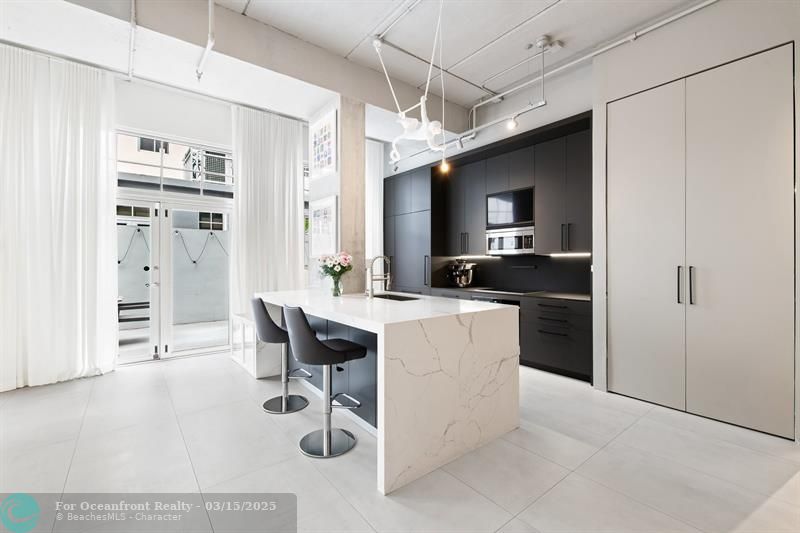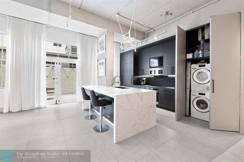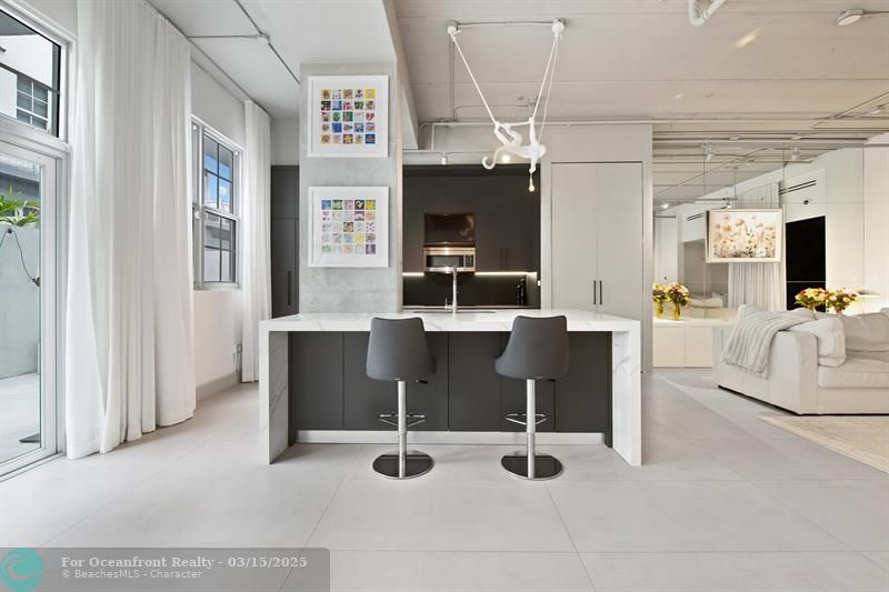 Modern luxury at Avenue Lofts in Flagler Village. This remodeled 1-bedroom loft features an oversized terrace, 12’ ceilings, and high-end designer finishes. The custom kitchen offers solid wood cabinets, quartz waterfall island, built-in TV, and Fisher & Paykel appliances. Spa-style bath with Kohler and Moen fixtures. Enjoy large porcelain tile floors, impact windows, in-unit washer/dryer, and custom cabinetry for ample storage. Unique lighting adds modern charm. Pet-friendly building with rooftop gym and pool. Prime location just 1/4 mile from Brightline and minutes to Las Olas. (Drapery not included.)
