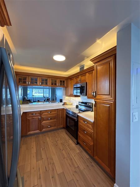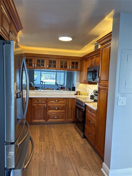 Absolutely Gorgeous 1st Floor Corner Unit. Breathtaking Water Views throughout! Corner Unit Has Extra Windows Allowing Plenty of Natural Light! Updated to Perfection with BEAUTIFUL Wood Floors Throughout. Gorgeous Updated Kitchen with New White Stone Countertops and New Refrigerator. Just Installed STUNNING Custom ZEBRA SHADE BLINDS. Both Bathrooms UPDATED! Beautiful Sunsets. Not to Mention the Kings point Community with Amenities Galore to live a Resort Lifestyle. Impact Windows! Fantastic 55+gated Community with 24 Hour Guard!