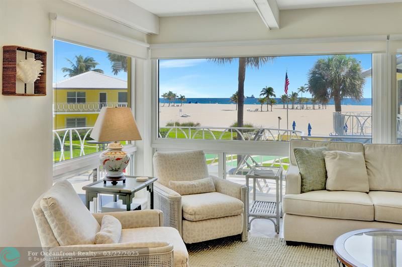 Rare opportunity to own Lovely Seaside 2 Bdrm/2 Bath Villa directly on Widest Private Beach in Town. Beautifully renovated w/breathtaking panoramic views of ocean, swaying palm trees, & pristine shoreline. Surrounded by hurricane impact glass, this sun-filled home brings the beauty of the outdoors inside. Open-concept kitchen features eat-at counter, while the enclosed sun porch offers a private 2nd entrance straight from beach, making it an ideal retreat for relaxation. Full-size washer and dryer included. Tile flooring thruout enhances coastal charm. Just a few sandy steps away, your private cabana awaits, offering a slice of paradise. Nestled in gated community, this exclusive property is a rare chance to own your dream villa by the sea! Co-Op. Cash Only, renting ok once/yr. Cats ok.