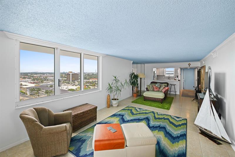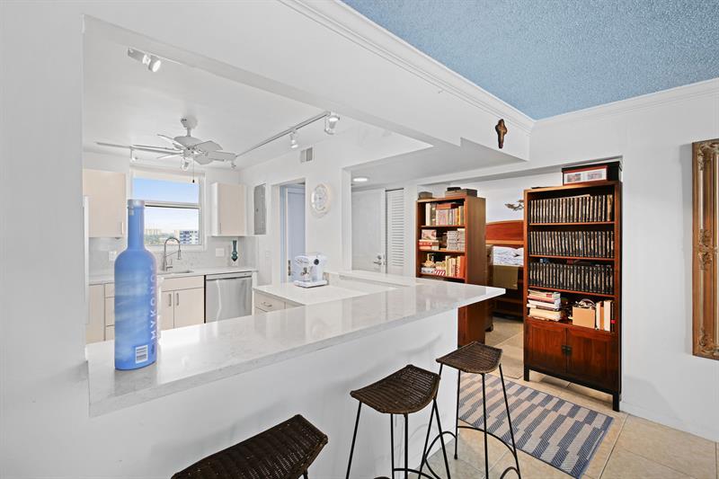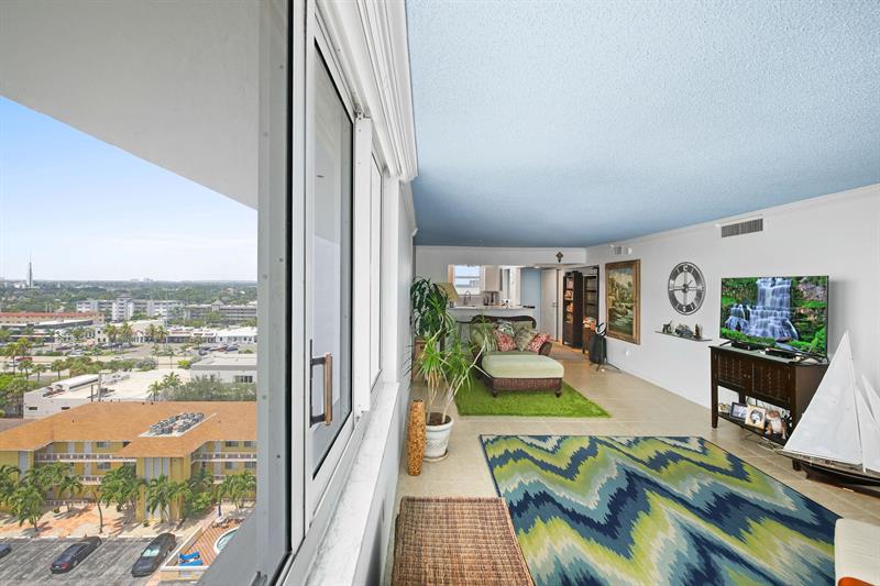 Views from every window! Large SW corner penthouse condo located steps away from the Commercial Blvd bridge entrance into LAUDERDALE BY THE SEA. New kitchen, floor to ceiling impact windows, and recent bathroom updates. Only one neighboring condo next door is divided by a solid concrete block wall, providing excellent sound insulation from next door. No neighbor above! Garage parking and ample guest parking. Common area, no fixed bridge/ deepwater dockage is available. Small pets are welcome. Building went through extensive concrete restoration and the roof was replaced in 2025. Great walkability to many restaurants, services and to the beach. Amazing sunsets and downtown views to the southwest and views to the ocean above 3 story height restricted, LAUDERDALE BY THE SEA, to the east.