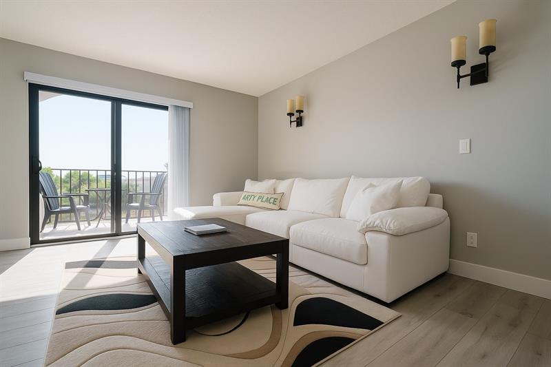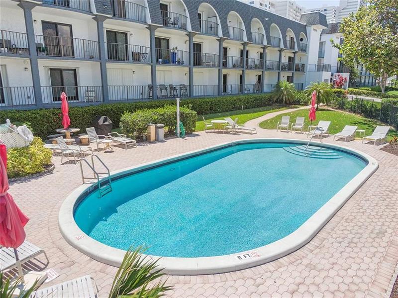 Situated in Lauderdale by the Sea, steps from the beach and a 5 minute walk to the pier, restaurants, shops, and dining, plus washer and dryer in unit and impact windows. Building has well over 10% reserves and qualifies for minimum down financing, a rare find. Rarely available top floor corner in the heart of town. Spacious 1 bed, 1.5 bath with updated white shaker cabinets, quartz counters, stainless appliances, newer 2018 A/C, and luxury vinyl flooring. Sliders from living room and bedroom open to a large double balcony with pool and neighborhood views. Boutique style building with only 47 units, gated garage parking, guest spaces, heated pool, huge storage unit, and bike room.