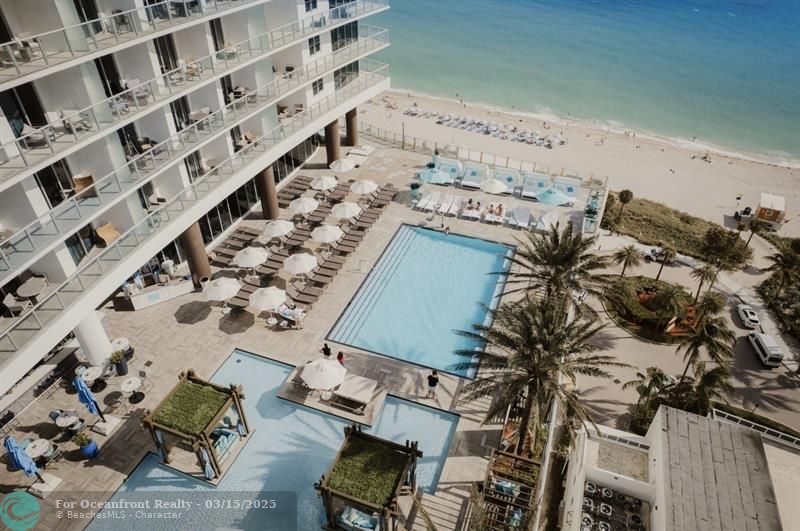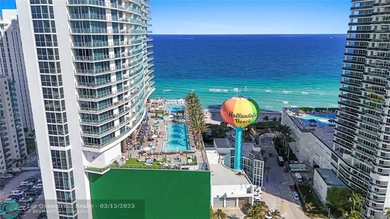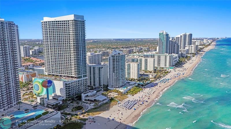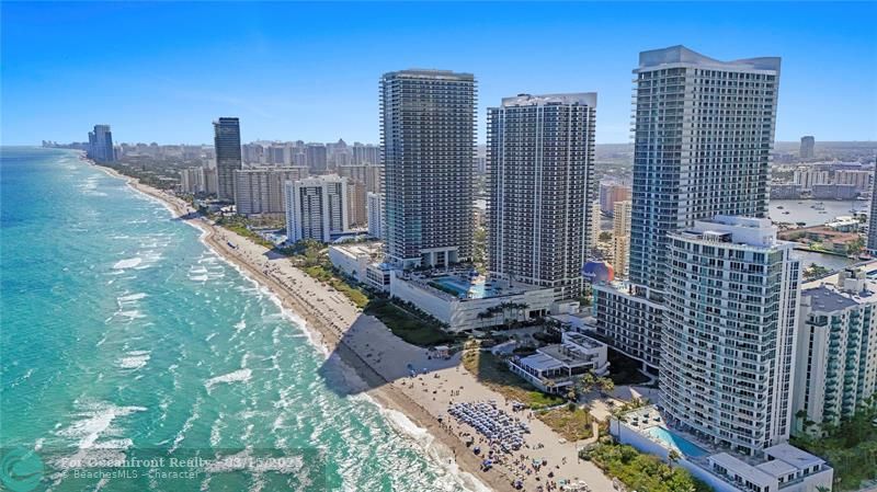 Resort-style amenities include beach and pool service, spa, gym, beauty salon, and on-site dining. Prime location just minutes from Hollywood Beach, Hallandale, and Aventura.