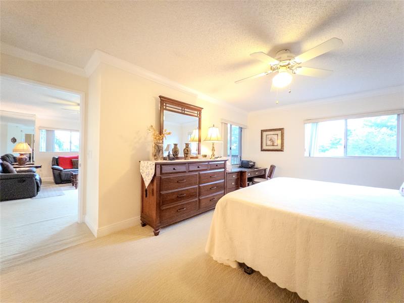 Spacious, sunlit 2-bed, 2-bath corner condo in the sought-after Suffolk II at Century Village! With over 1,500 sq ft, this lakefront unit features a split floorplan, in-unit washer & dryer. The enclosed balcony is perfect for relaxing with water views-stunning sunsets. Well equipped galley kitchen offers plenty of storage. Oversized primary suite with a large walk-in closet and shower. Enjoy maintenance-free living in a vibrant 55+ community with resort-style amenities—clubhouse, pools, golf inclued, tennis, theater, fitness center, restaurant, courtesy bus & more. Basic cable, sewer, water, reserves, roof, 24-hour security, exterior insurance included. No assessments. Prime location near shops, houses of worship, dining, medical offices! 650+ credit, No rentals 2 years. Furniture conveys