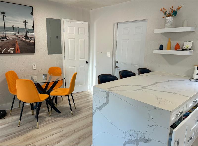 Charming, Fully Updated & Move-In Ready home featuring a modern open-concept floor plan & stylish upgrades throughout with an 2018 roof and impact windows! The heart of the home is the beautifully renovated kitchen with white shaker cabinets, granite countertops, stainless steel appliances, & a large center island perfect for entertaining. The gray & white color palette, complemented by durable luxury vinyl flooring throughout, creates a fresh and inviting vibe. A split-bedroom layout for added privacy, & an indoor laundry room that offers potential for a second bathroom. Step outside to a spacious, fully fenced backyard with a brand-new fence, plenty of room to build your dream pool or create the ultimate outdoor oasis with new sprinkler system.