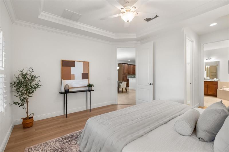 Stunning 4-bedroom, 4-bath home in the exclusive Eagle Creek Golf Community near Lake Nona. Enjoy luxury, leisure, & location in this beautifully maintained home with crown molding, plantation shutters, & spacious 1st floor primary suite with luxury vinyl flooring. The gourmet kitchen opens to a bright living area perfect for entertaining. Upstairs features a loft, new plush carpeting & 3 bedrooms one has private balcony overlooking the golf course. Relax on the extended screened patio with serene golf views. Smart home features, blink cameras, keyless entry, custom window treatments & 2car garage. Enjoy resort-style amenities:pickleball, tennis, pools, fitness center, splash pads, playgrounds, and 24-hour manned security—all minutes from top-rated schools, Medical City, and fine dining.