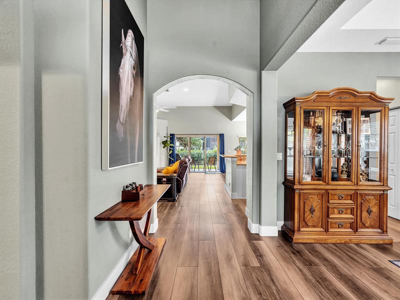 Nestled in the sought after city of Parkland, this beautifully upgraded home features elegant vaulted ceilings, long dark wood-like plank floors, stately 5-inch baseboard & recessed lighting. The kitchen offers LG stainless steel appliances, wraparound bullnose-edge granite counters, breakfast bar, & bright white wood cabinets. Master bedroom includes 2 walk-in closets with an ensuite with dual vanities, a makeup table & spa-like tub. The spacious 2-car garage features a level 2 charger for EV charging & fenced backyard with covered patio, with growing Clusia hedge. The man gated community of Parkland Isles offers resort-style amenities like clubhouse, gym, pools, playground, pickleball, & basketball court. The low HOA includes cable, speedy 500 Mbps internet & alarm service from ADT