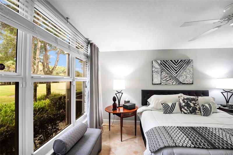 Designer dream 3BR/2.5BA “F†model in 2-story, 1st floor, pet-friendly Cypress Grove. Features full impact windows and a triple sliding glass door opening to the porch plus accordion shutters throughout. Elegant 24x24 travertine marble flows throughout the entire apartment. Renovated kitchen with granite countertops, stainless steel appliances, and 3-door refrigerator. Newer washer and dryer. Updated bathrooms with enlarged primary. Additional upgrades include crown molding, 4 ceiling fans, new door hardware, designer chandelier in dining area, barn door in primary bedroom, and French doors to third bedroom—ideal for den or office. Roof replaced (2019), electrical panel replaced. Parking just steps to your front door. 24-hour notice requested. Pet on premises. Don't miss this one!