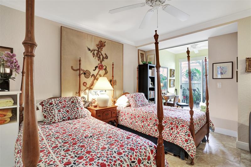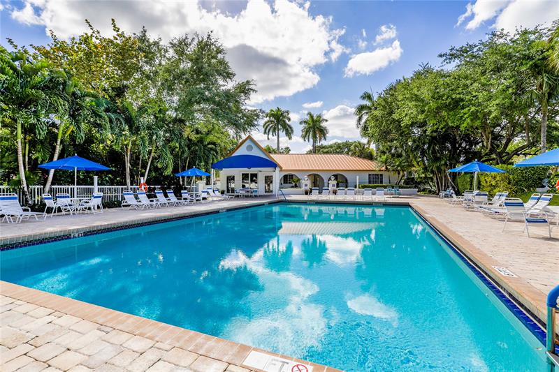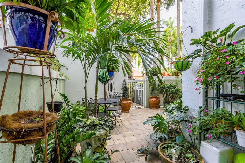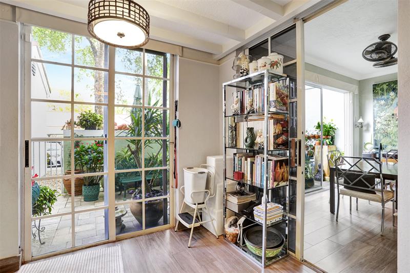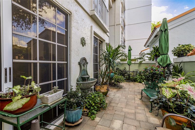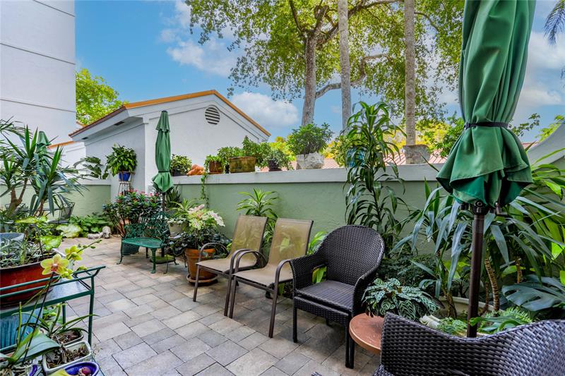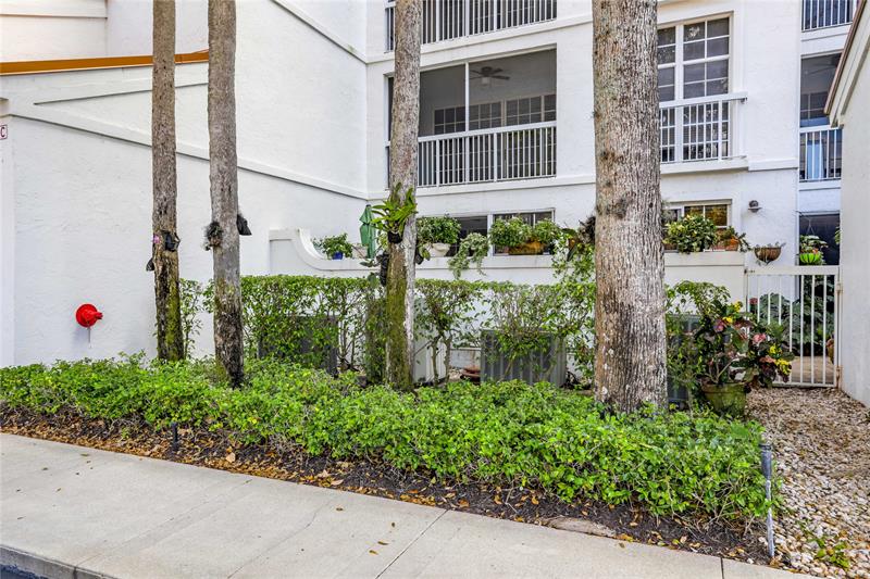 Perfect first-floor featuring a private, charming outdoor garden that offers the feel of a single-family home with the security of condo living. Enclosed glass patios expand the living space. The primary bedroom and office/third bedroom overlook the golf course, while the secondary bedroom includes a sitting area and direct access to the private garden. The spacious primary suite offers a large walk-in closet and an en-suite bath with dual sinks, a Roman tub, and a separate shower. Wet bar in the family room, an interior laundry room with full-size washer and dryer, abundant closet space, and a dedicated storage room. One covered parking space plus ample parking. Gated with a secured lobby, an additional private entrance from garden, and a clubhouse with heated pool just a short walk away.