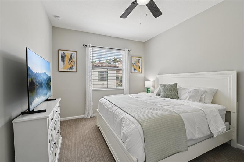 Beautifully updated 3BR/2.5BA townhome with split 2-car garage in the resort-style community of Artesia. The main level features tile flooring, a stylish dry bar, and a fully renovated kitchen with quartz countertops, subway tile backsplash, grey shaker cabinets, gas range, and stainless steel appliances, opening to a spacious dining and living area plus half bath. Upstairs, the primary suite offers vaulted tray ceilings, a walk-in closet and a spa-like bath with dual sinks, a soaking tub and a separate shower. Two additional bedrooms, a full bath, and laundry complete the second floor. Highlights include a 2-year-old A/C, impact windows/doors, a private fenced patio, and ample guest parking. Community amenities: 2 pools, fitness center, indoor basketball, tennis, pickleball and playground