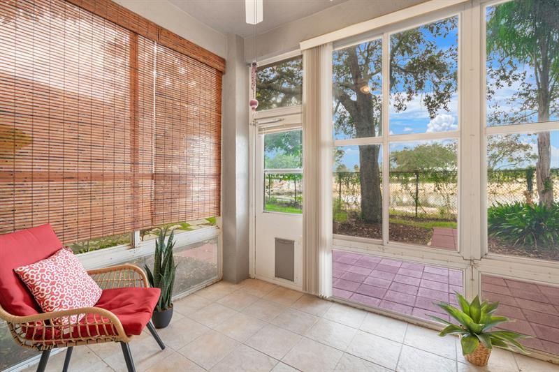 Beautifully maintained 2BR/2BA corner unit in the desirable gated community of Regency Club. This light-filled unit features vaulted ceilings, a spacious split floor plan, and extra windows for added brightness and views of the outside. The oversized primary with 2 walk-in closets and a private screened sunroom w/ tranquil lake views. Enjoy a large back patio shaded by mature trees, perfect for relaxing outdoors. One-car garage and located just steps from the pool and clubhouse. Freshly painted and move-in ready, this unit also features a newer HVAC system (2021) and shutters for worry-free living. Low HOA covers lawn care, cable, 2 pools, spas, 2 clubhouses, gym, tennis & basketball courts. Conveniently located just off Oakland Park Blvd with easy access to shops, dining, and major roads.