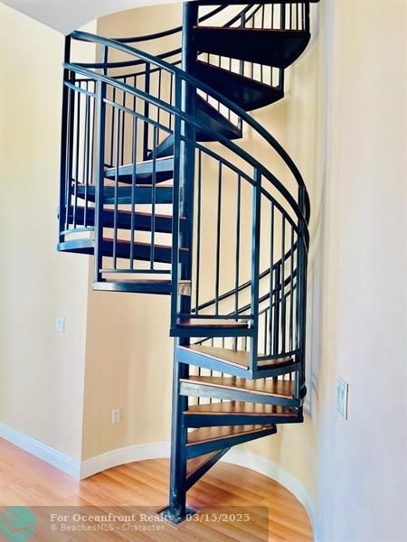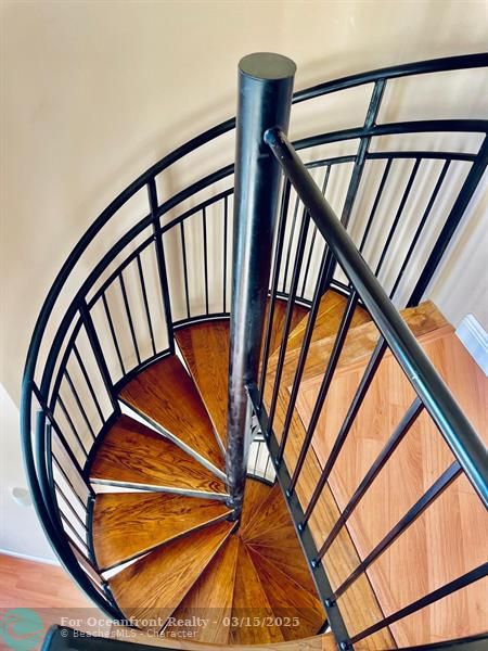 A wrought iron spiral staircase leads to the second-floor primary suite with 2 walk-in closets.