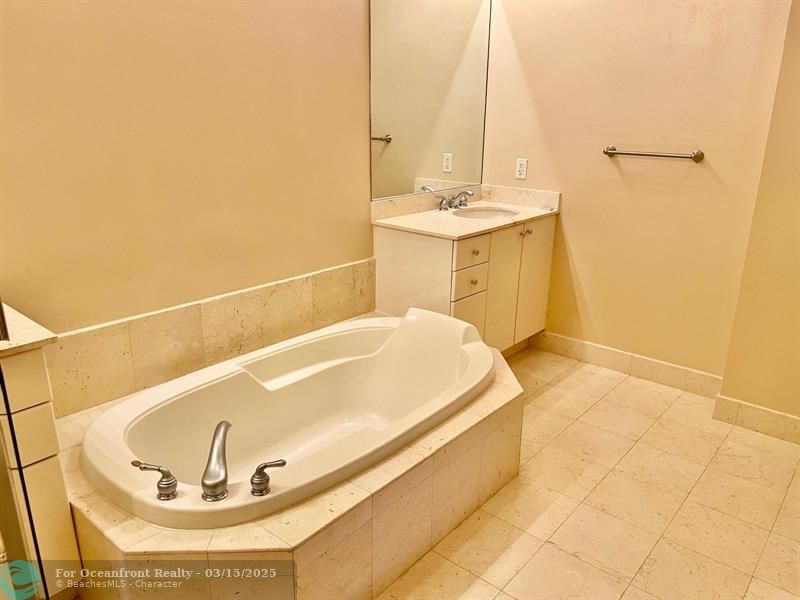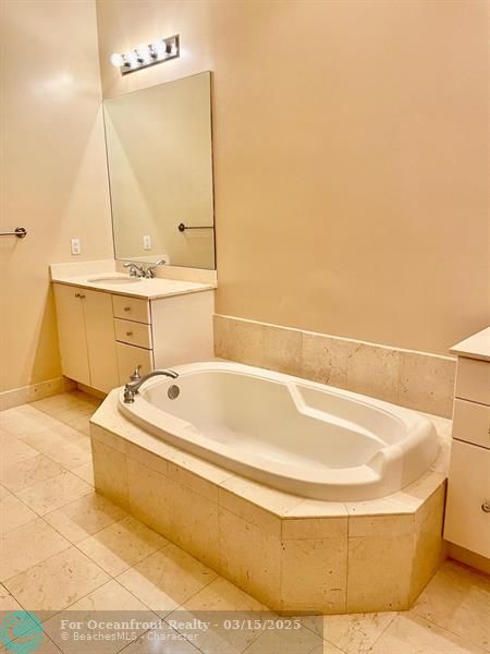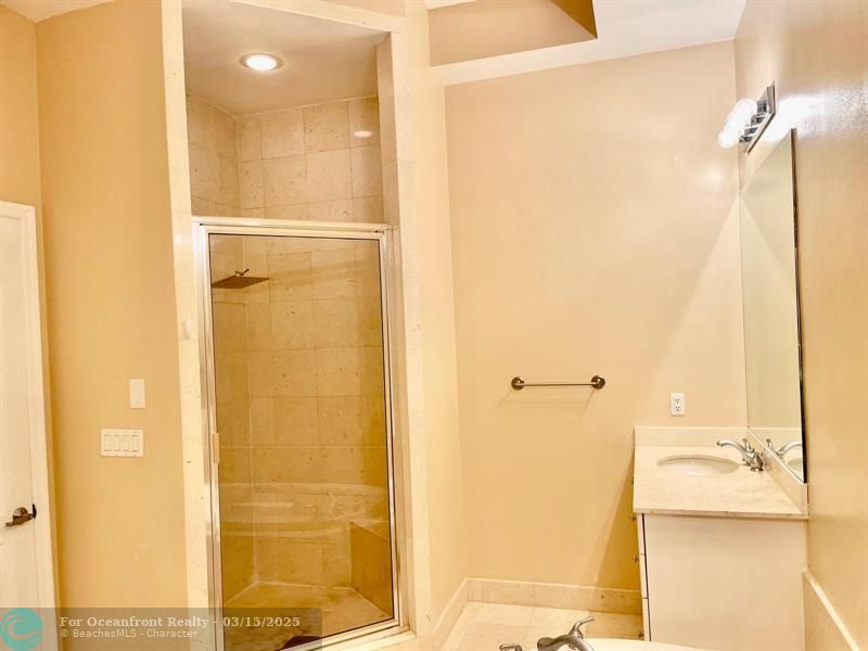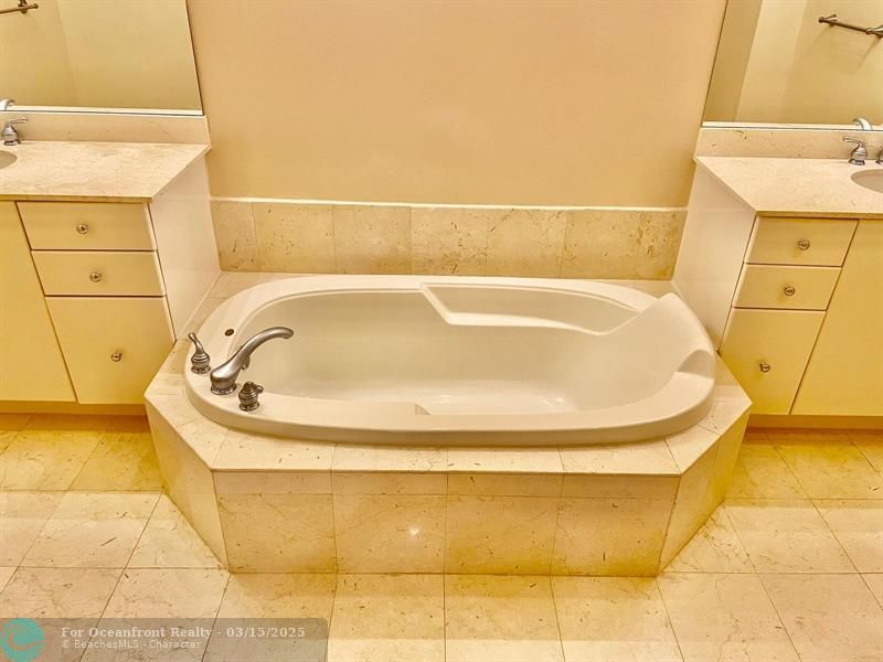 The bathroom has a walk-in shower, bathtub, and dual vanities.