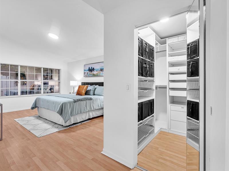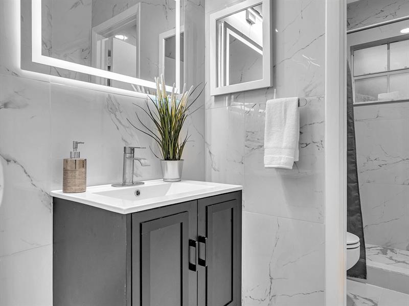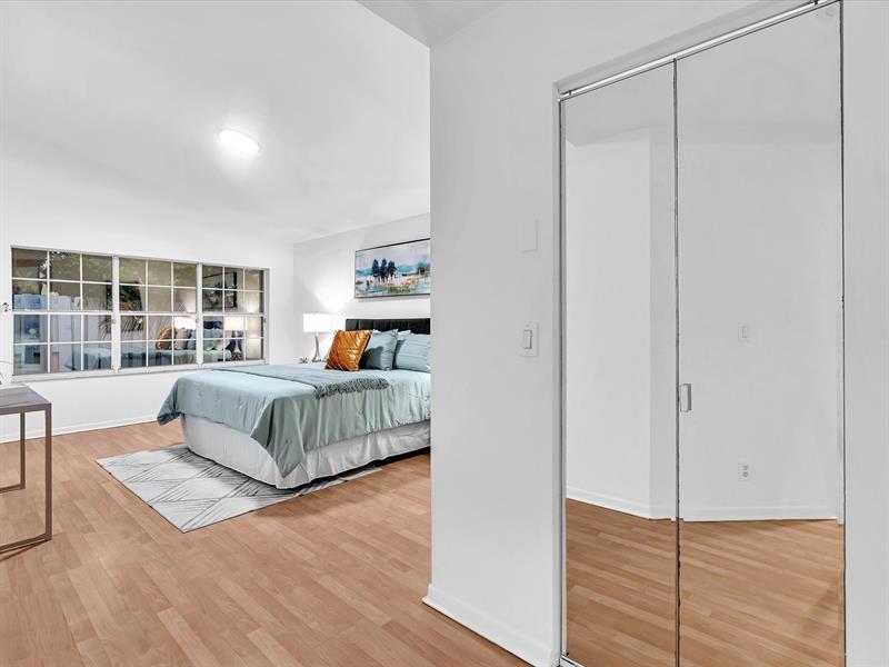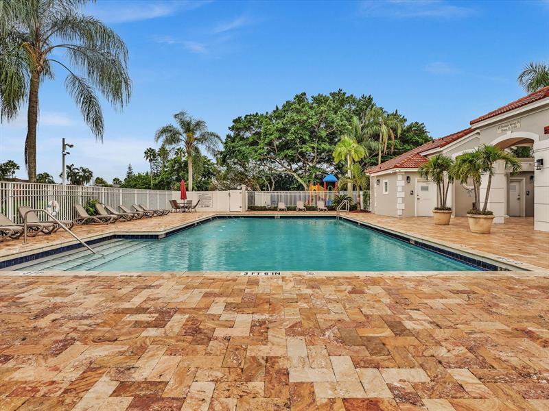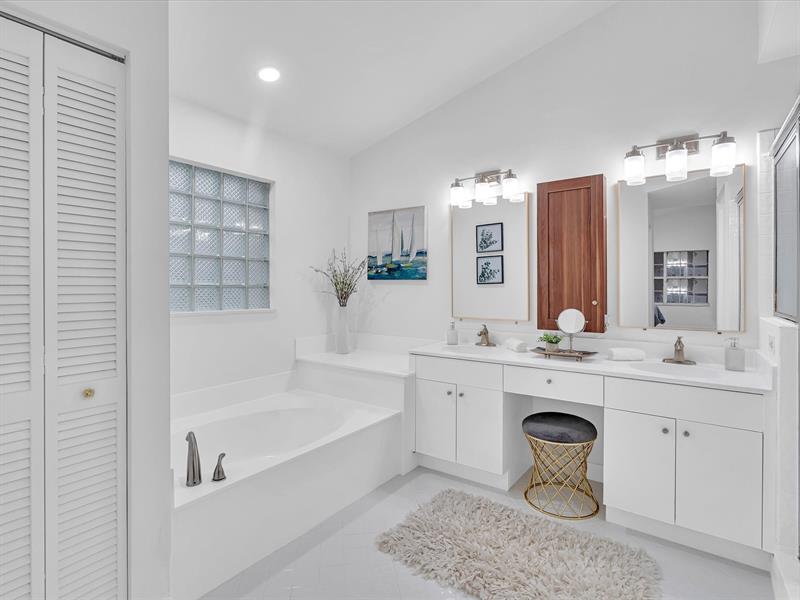 The split layout offers a spacious primary suite with its own bath, two additional bedrooms with a beautifully remodeled second bath, plus laundry room, two-car garage, pavered driveway and entry, and accordion shutters. Photos have been added simulating one solid floor throughout.