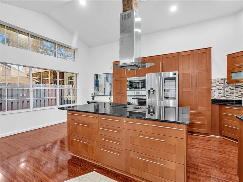 The expanded kitchen—with abundant cabinetry, large island, induction cooktop, and smart-panel stainless steel refrigerator—sets the stage for preparing and enjoying dinner together.