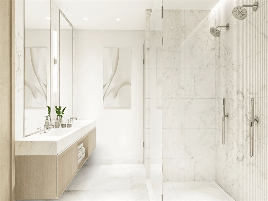Walls of floor-to-ceiling, impact-resistant glass frame the magnificent, unobstructed panoramic views that stretch across the turquoise waters of Biscayne Bay to the Atlantic Ocean and the glittering Miami skyline. Each residence flows seamlessly onto an expansive private terrace, creating the quintessential indoor-outdoor living experience that is the hallmark of South Florida luxury. The gourmet kitchens are masterpieces of form and function, stylishly curated with custom European cabinetry and elegant Quartz stone countertops, and featuring a full, top-of-the-line Miele® appliance package. The primary and secondary bathrooms are designed as private wellness retreats, appointed with natural marble stone flooring and large, glass-enclosed showers with dual rainfall shower heads.