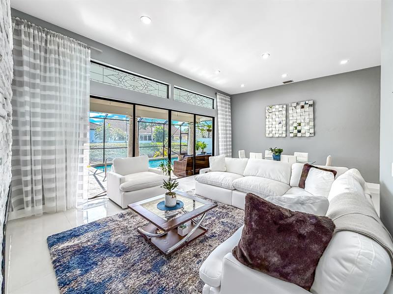 Welcome to luxury country-club living without the mandatory membership! Nestled in the highly sought-after Villa Flora enclave of Boca Pointe, this stunning single-family home with a pool offers 3 spacious bedrooms, 3 full bathrooms, and over 2,300 sq ft of elegantly updated living space. Step inside to soaring volume ceilings, an abundance of natural light, and an open-concept floor plan perfect for both entertaining and everyday living. All newer tile floors throughout, updated bathrooms and brand new kitchen appliances (2025). Enjoy true South Florida living in your private screened lanai and sparkling pool overlooking the lake — perfect for morning coffee or sunset cocktails.