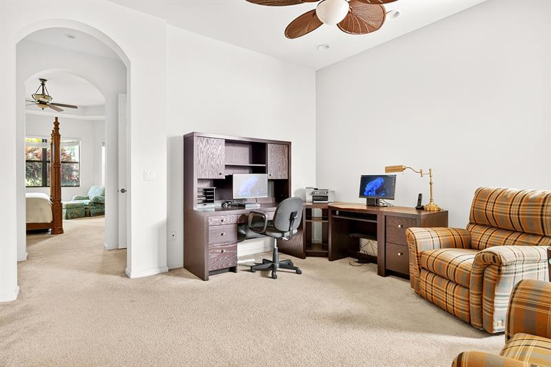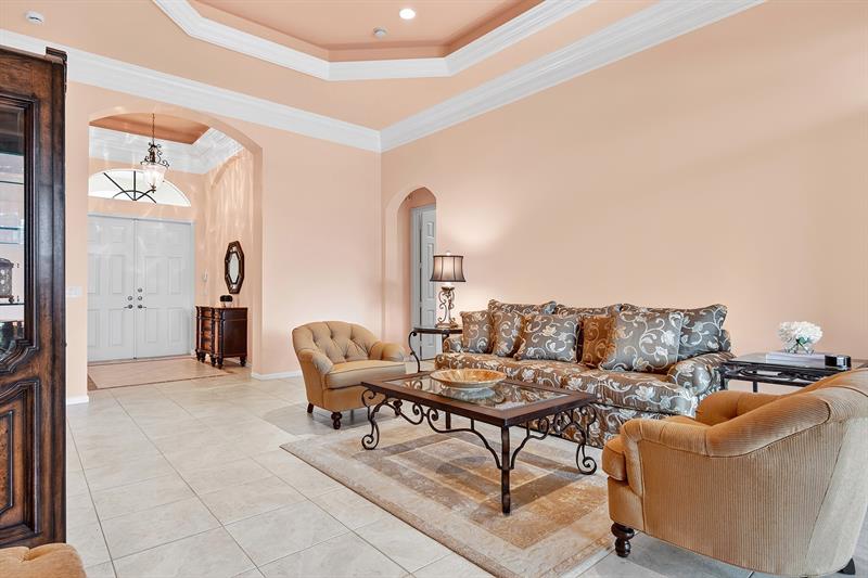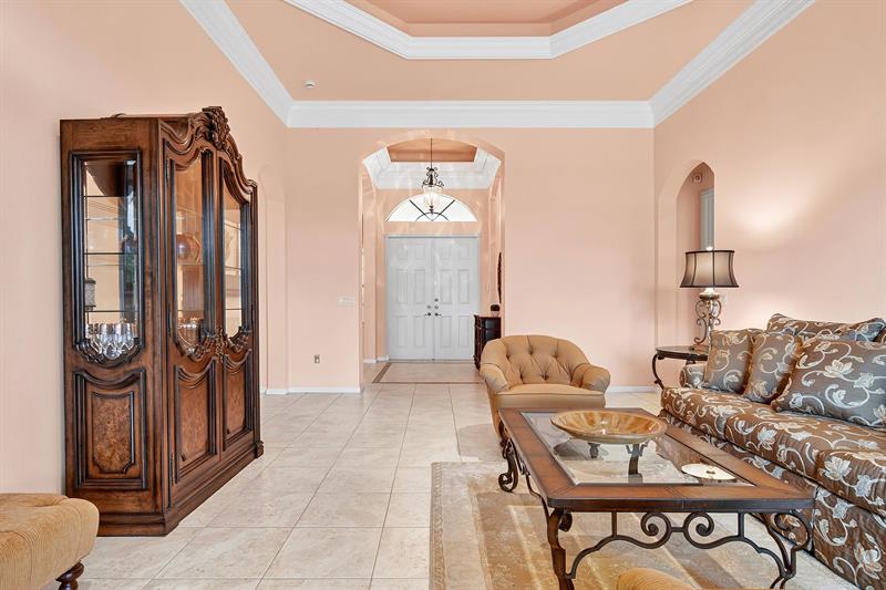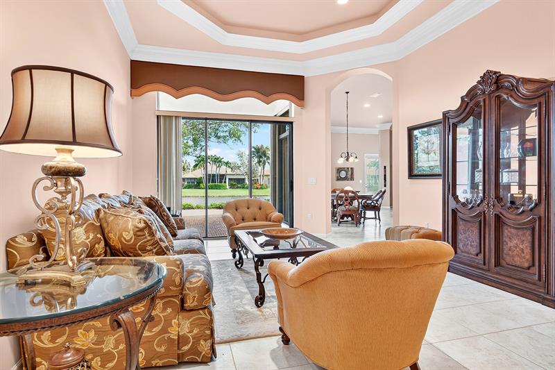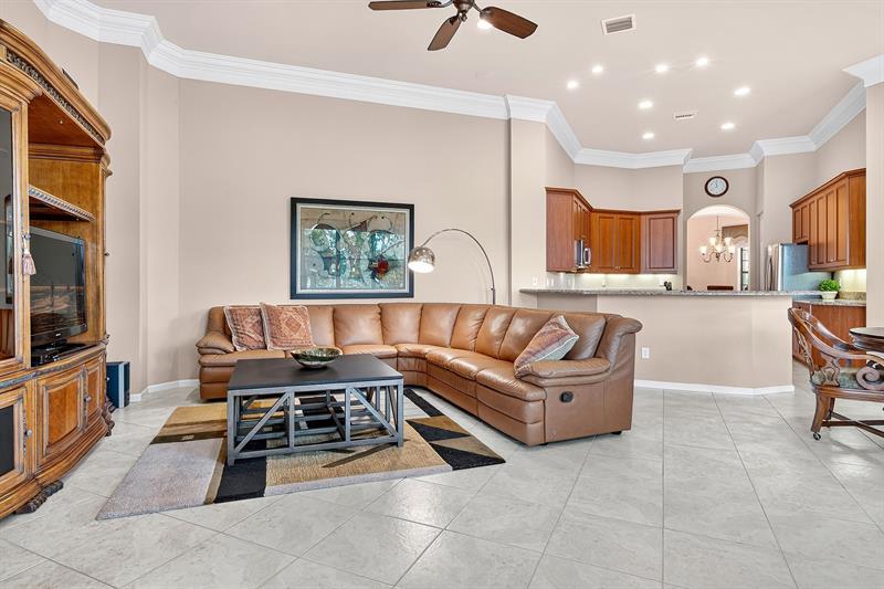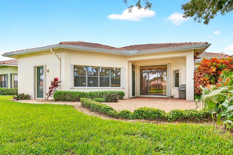 New Price! Tivoli Lakes | Popular Brunello floor plan (Estate Collection) boasting 3 BR + Den and 2.5 BA. Sited on a beautiful lakefront lot, this expansive one-level Mediterranean-style home offers an open floor plan w/multiple entertaining spaces + a north-facing covered veranda surrounded by lush landscaping. Kitchen w/breakfast bar, pantry, granite, and ss appliances. Primary suite w/walk-in closets, den, and ensuite bath. Soaring 11 ft+ ceiling | Crown molding | Recessed lighting. Tivoli Lakes is a premier gated 55+ community with manned security 24/7. Relish the active lifestyle w/stunning clubhouse, social hall, card rooms, gathering room w/bar, fitness center, and aerobics room. Tennis | Pickleball | Bocce Ball | Billiards | Pool. Convenient to PBI Airport, retail, + the beaches!