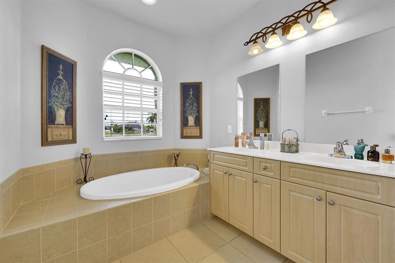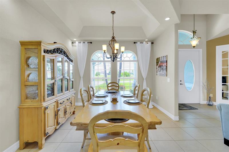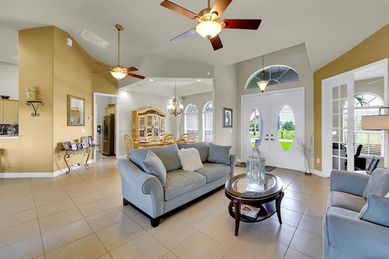 Welcome to this stunning 3-bedroom, plus den, custom-built home in Cape Coral's highly sought-after Burnt Store Road corridor, featuring 2,096 sqft of spacious living space. The owner's suite boasts luxurious features, including high cathedral ceilings, double walk-in closets, a relaxing soaker tub, a separate shower, and a stylish dual sink vanity. The impressive open-concept living space features a modern kitchen with breakfast bar seating and spotless Corian countertops, complemented by top-grade stainless steel appliances. The home also showcases wood flooring and tile throughout, ceiling fans for optimal airflow, a separate laundry room with ample cabinets, and an enclosed lanai for relaxation and enjoying the beautiful Florida sunshine.