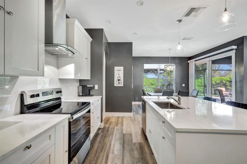 Modern design meets true Florida relaxation in this 2021 pool home offering style, comfort, and privacy. The open layout features tray ceilings, tall doors, recessed lighting, and wide sliders that brighten the space. The kitchen includes a large island, stainless appliances with hood vent, single-basin sink, dry bar, and ample cabinetry. The split-bedroom plan offers a sleek pool bath and guest rooms with tray ceilings. The primary suite features two walk-in closets, a soaking tub, dual floating vanities, and a tiled shower with dual heads. Outside, enjoy an electric-heated pool with glass tile, screened lanai, and versatile deck framed by a Calusa hedge. Impact windows/doors, a three-car garage, irrigation, and HVAC servicing add peace of mind.