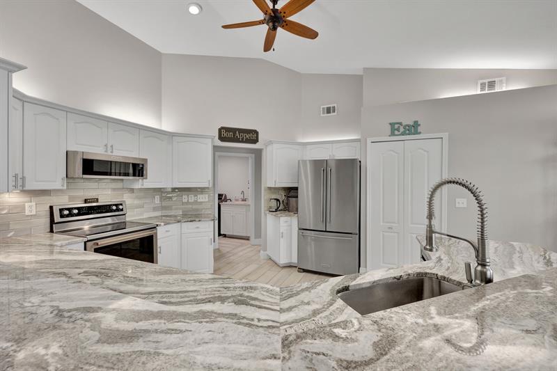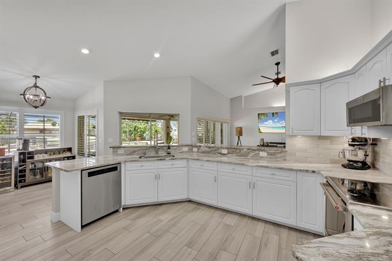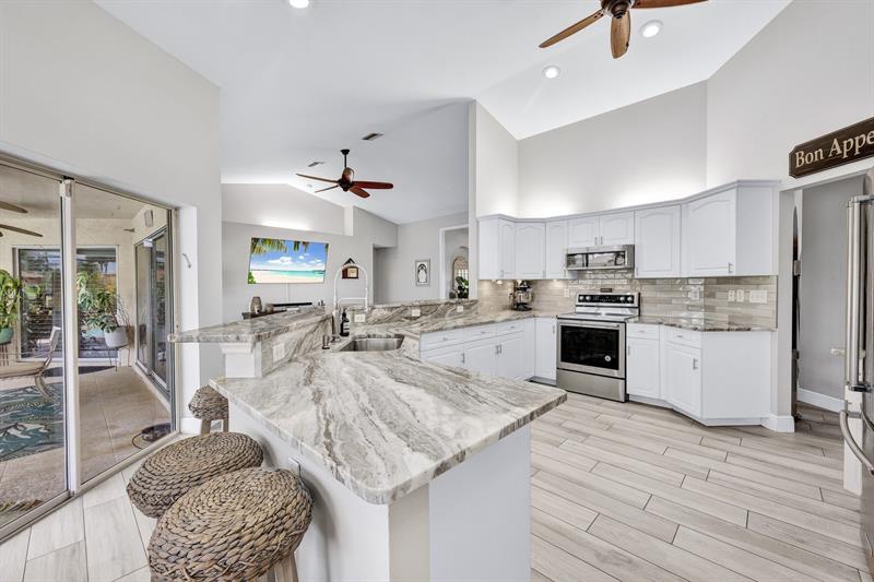 WESTERN EXPOSURE GULF-ACCESS POOL HOME w/DOCK & LIFT! Enjoy tropical landscaping, lava rock accents, and a screened double French-door entry. Inside, vaulted ceilings and open living spaces flow to a granite kitchen with tile backsplash, farmhouse sink, KitchenAid appliances, pantry, and breakfast nook overlooking the water. The owner’s suite has sliders to the lanai and a spa bath with dual sinks, vanity, walk-in shower, and tub. Features include tile floors (2021), new roof (2022), new screens, newer A/C & water heater, UV system, fenced yard, and dog run. The electric-heated saltwater pool, waterfall, and dock with lift complete your private paradise—just 35 minutes to open water!