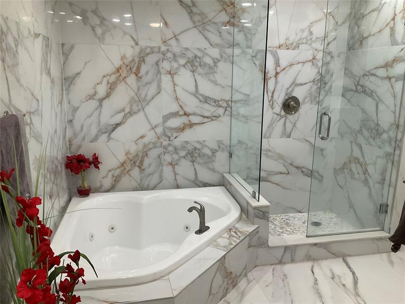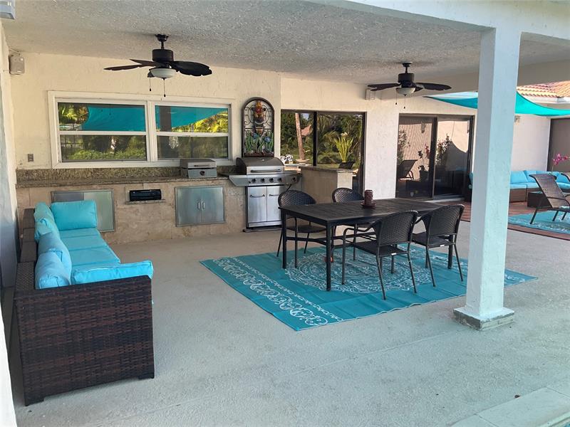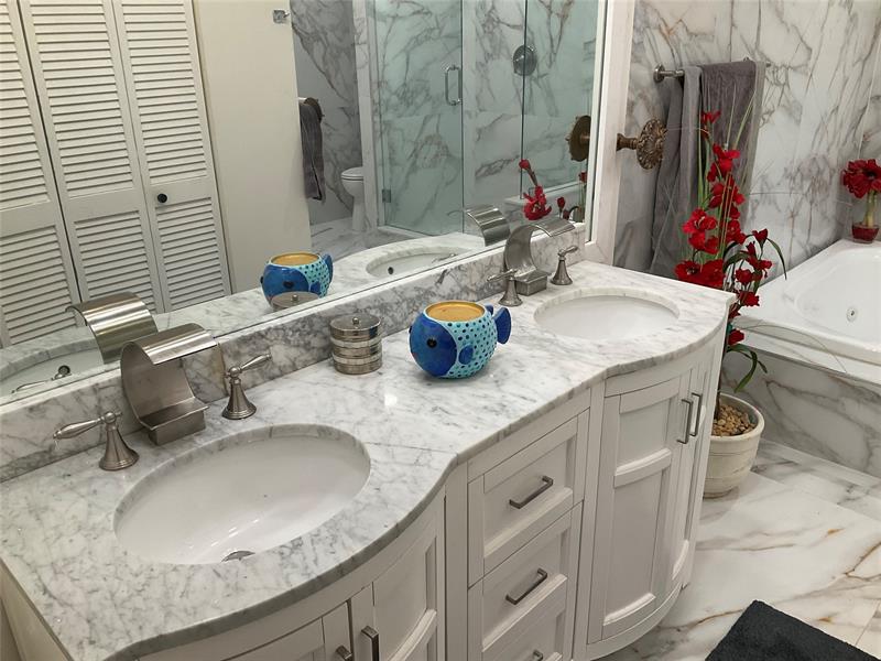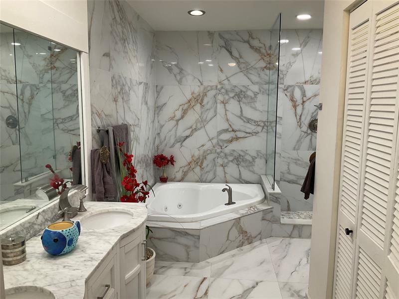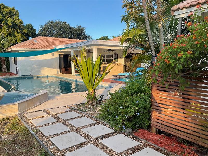 This beautifully kept home features two spacious master suites, huge walk in closets, a cedar closet, new roof 2025, newer a/c's, new tile & a gourmet kitchen with custom cabinetry, stainless appliances & waterfall granite countertops. The resort style backyard boasts an oversized diving pool, fountain, gazebo, large garden with deck and gorgeous sunset views.