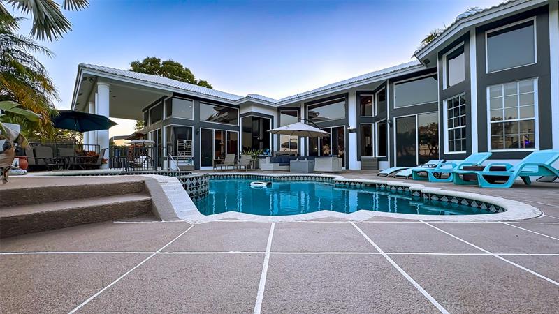 Panoramic golf and water views! Elegant home located on the 8th Fairway featuring a newer roof, newer AC units, freshly polished marble floors, and newly installed wood-plank flooring in bedrooms and office. Light and bright split floor plan with soaring ceilings and abundant recessed lighting. Offers four en-suite bedrooms plus office, four and a half baths including cabana bath, spacious master suite with sitting area and large glass sliders overlooking the pool, patio, and golf course. Master bath includes water closet, bidet, jacuzzi tub, walk-in shower, and ample closet. Gourmet kitchen with built-ins, wine closet. Beautiful backyard with covered patio, summer kitchen, and pool with jacuzzi overlooking the fairway. 3-car garage with built-ins. Located in a gated golf course community