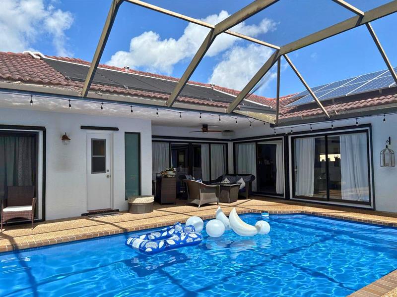 Beautifully updated home in Coral Springs with spacious living and Florida rooms opening to a resurfaced screened pool. Features include granite kitchen countertops, stainless appliances, modern bathrooms, tile and laminate flooring, built-in ceiling speakers throughout, and prewired networking. Energy-efficient upgrades include a 5kW solar electric system, solar water heater, solar and electric pool heaters, and variable-speed pump. Large master with walk-in closet, 2-car garage with attic storage. Located in a quiet cul-de-sac near top-rated schools, Fresh exterior paint, move-in ready!
