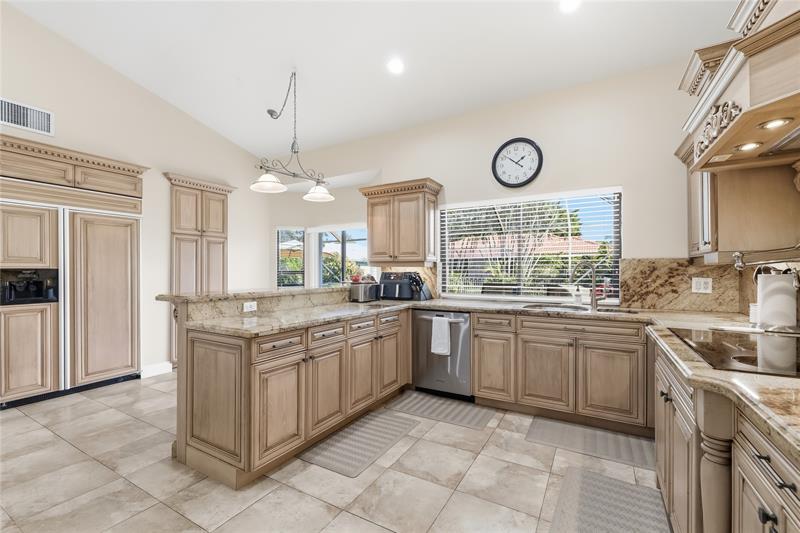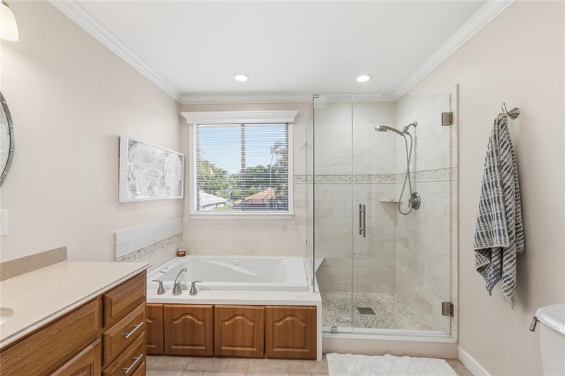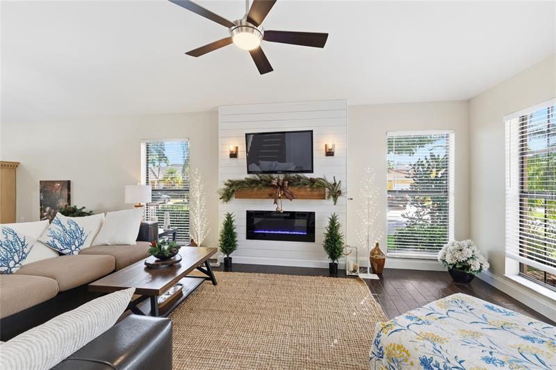 Beautifully updated 4BR/3BA home in a quiet cul-de-sac with a rare full bed & bath downstairs, perfect for guests or in-laws! Features include a double-width staircase, two built-in fireplaces, high-end kitchen w/induction flat top stove, high end appliances, pot filler, and more! Spacious family room (optional 5th bedroom) leading to a screened-in, newly installed travertine patio & renovated heated pool (2023). Upstairs, the large primary suite offers a walk-in closet, remodeled bath, and covered balcony overlooking the salt water pool. Low HOA, great schools, all closets have built-ins, corner fenced in lot, new awnings, and high speed fiber option internet/cable. This is a GREAT neighborhood for pets & families. Seller-preferred lender offers up to $5,000 buyer credit at no cost!