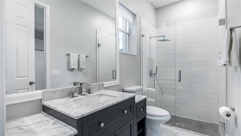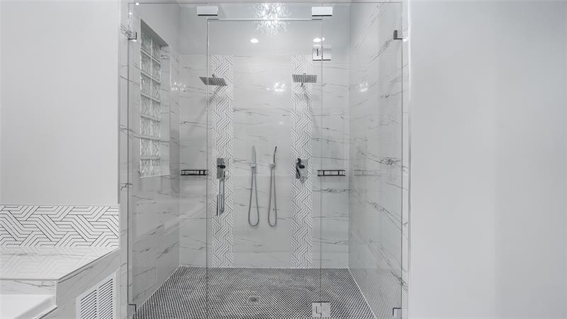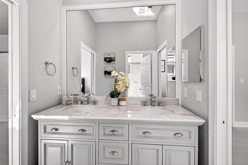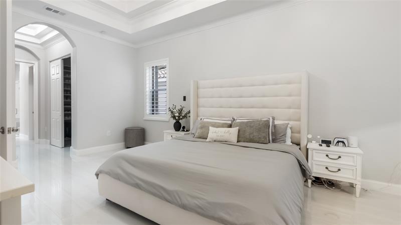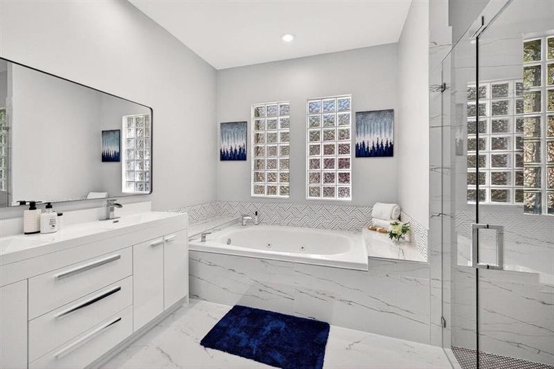 Relax in the spa-style suite featuring a jacuzzi tub, dual-head shower, and dual private toilet areas. Major upgrades include a 2024 roof, 2024 A/C units, 2020 water heater, accordion shutters, and 3-car garage.