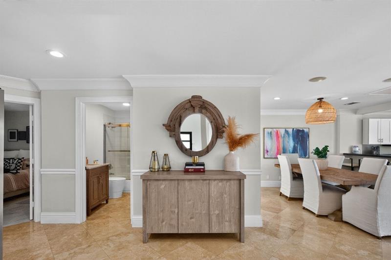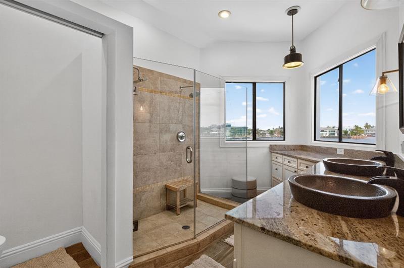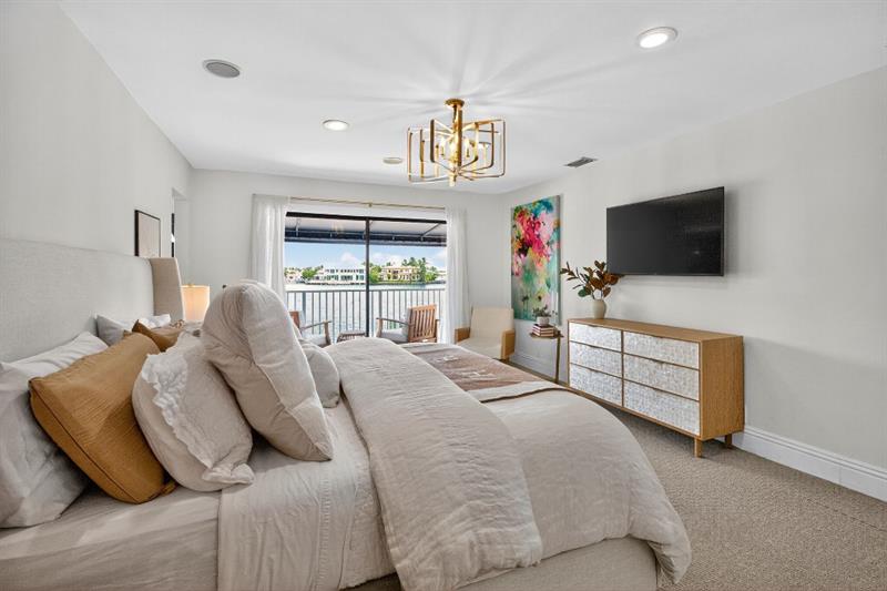 The primary suite is a true retreat, with a private balcony overlooking the water, a spa-like bath with dual vanities, and generous walk-in closets.