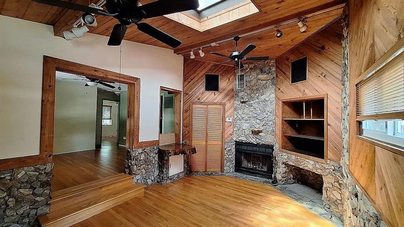 Welcome to this beautifully maintained home featuring vaulted wood-beam ceilings with skylights, a cozy wood-burning fireplace, and a warm blend of hardwood, travertine marble, and tile flooring throughout.