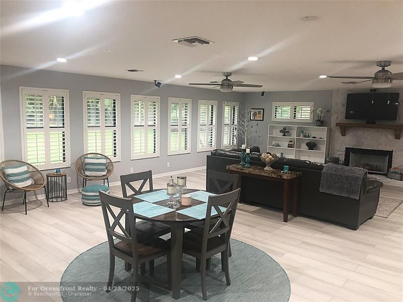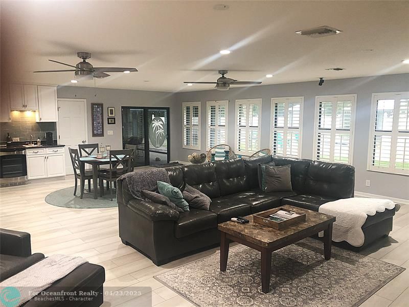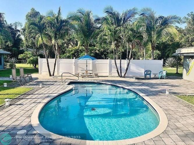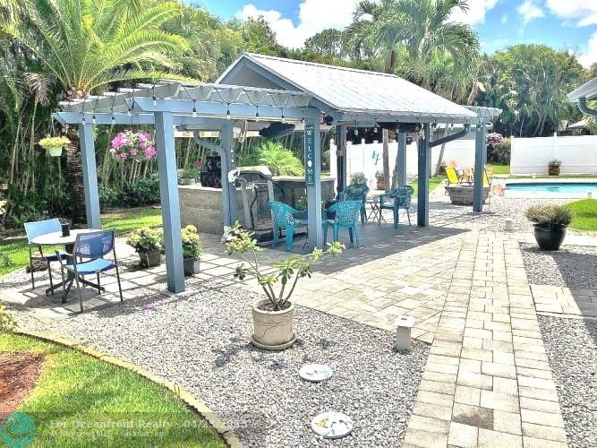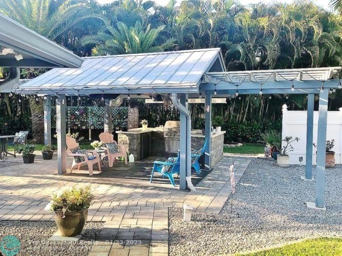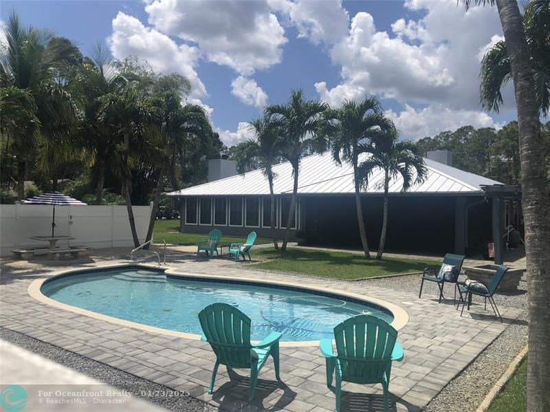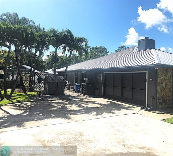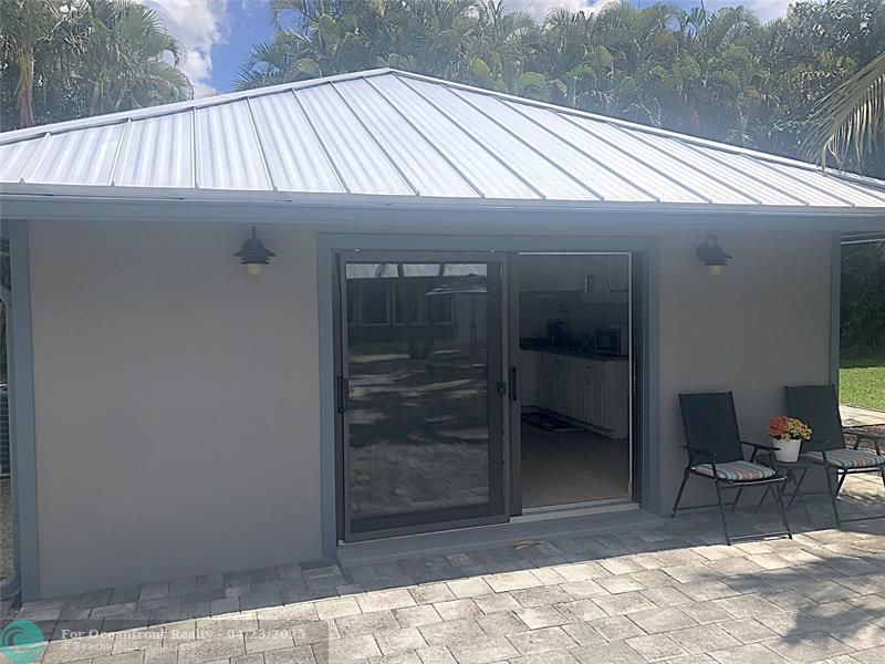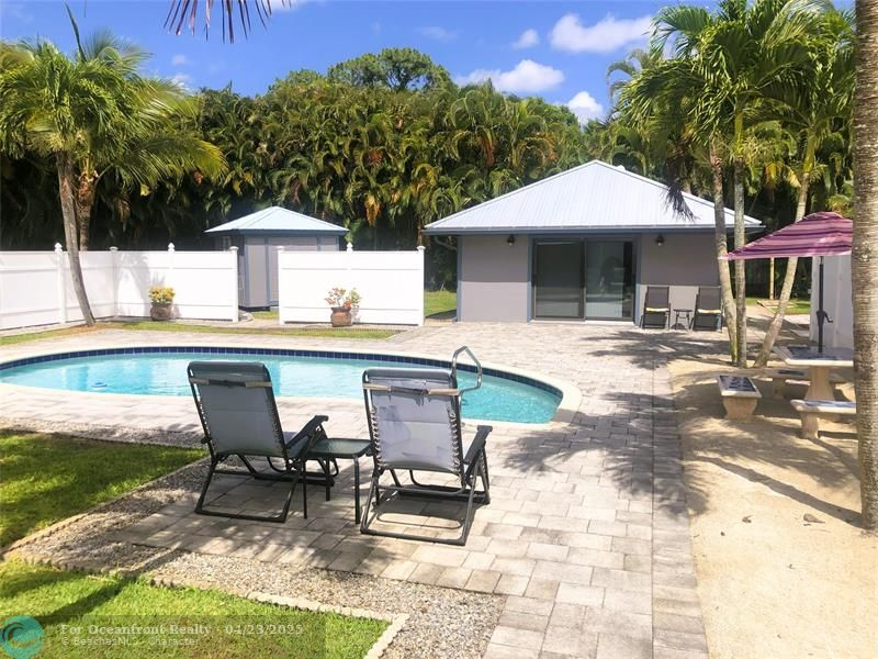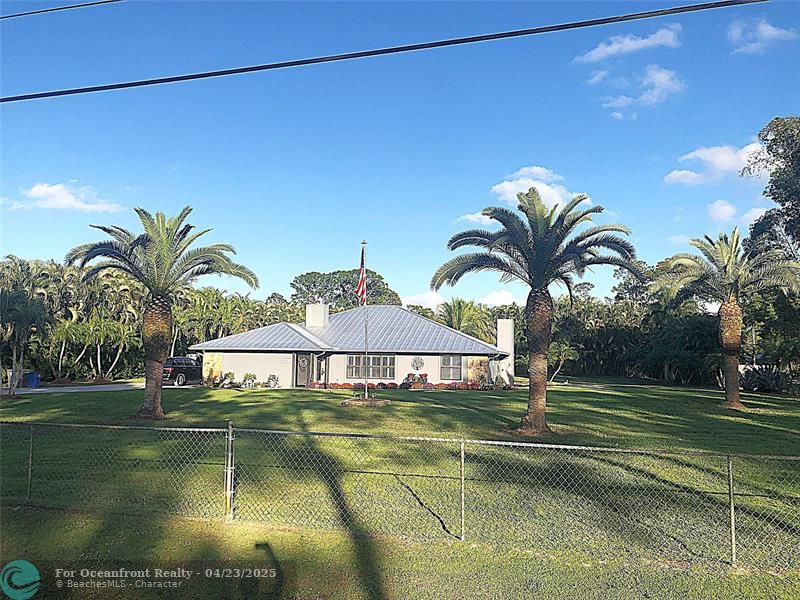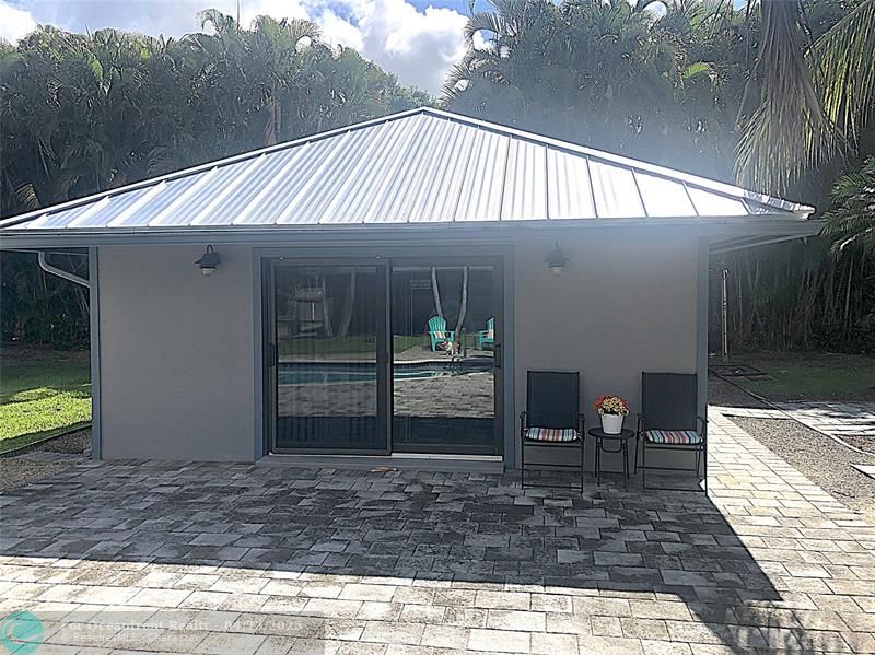 Beautiful 3/2, two car garage in Jupiter Farms featuring New 2024 standing seam metal roof on main and guest house, Main home is 2501 sf, under air with split plan. Completely Fenced In! Hurricane impact windows and sliders on main and guest house. Updated detached 500 sq ft 1b/1b guest house /or In- Law suite that is completely furnished with plantation shutters, full kitchen and bath, New tankless water heater, 2 ton a/c, TV, and an all in one Smart LG W/D combo. Main home features granite counter tops and ample cabinetry, pantry, 900 sf great room with fireplace, wet bar, LG appliances, convection oven, microwave, refrigerator, and dishwasher. Brand new W/D with 5 yr warranty. Two wood burning fireplaces, plantation shutters, new wood flooring throughout, 5 ton a/c.
