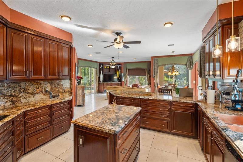The inviting open layout includes a gourmet kitchen with rich cherry cabinetry, granite countertops, a center island, and a large snack bar.