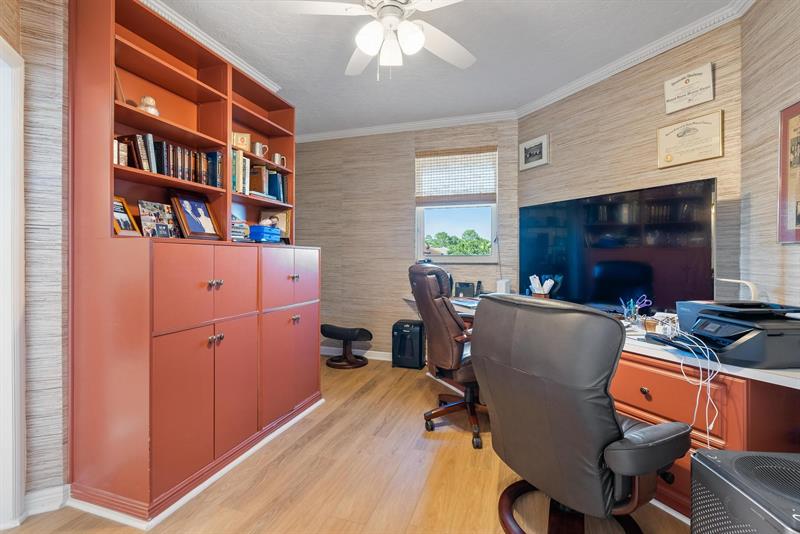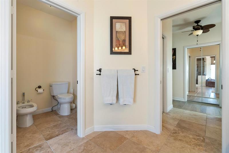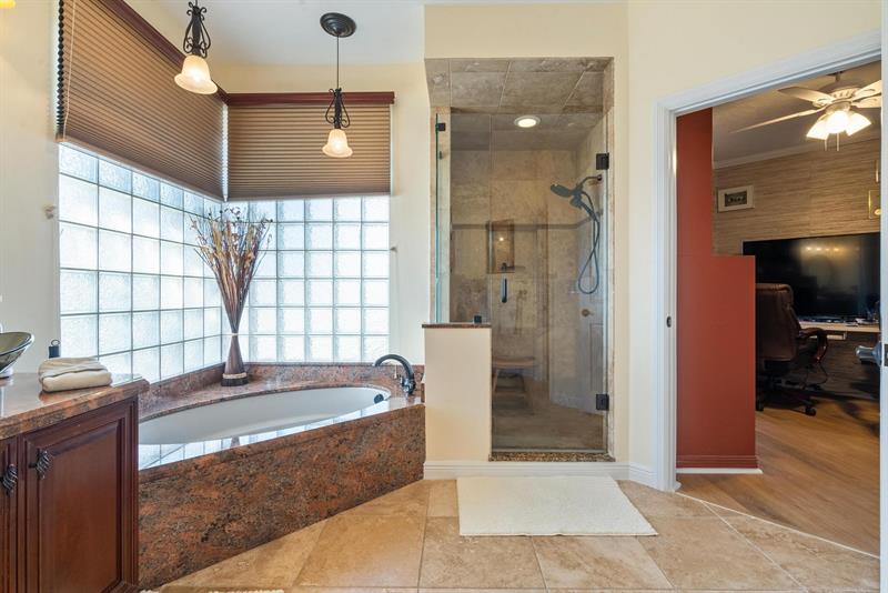 The expansive second-floor primary suite is a private retreat featuring a separate office, wet bar, and cozy fireplace, all with tranquil pool and water views.