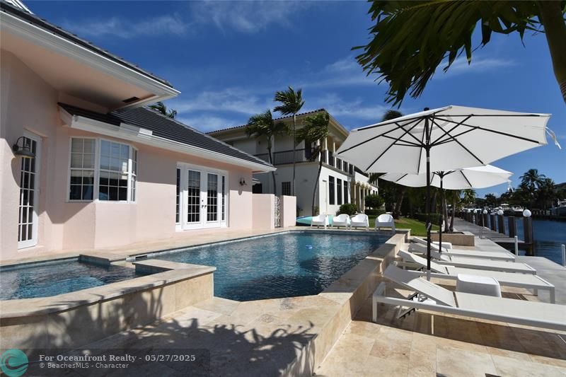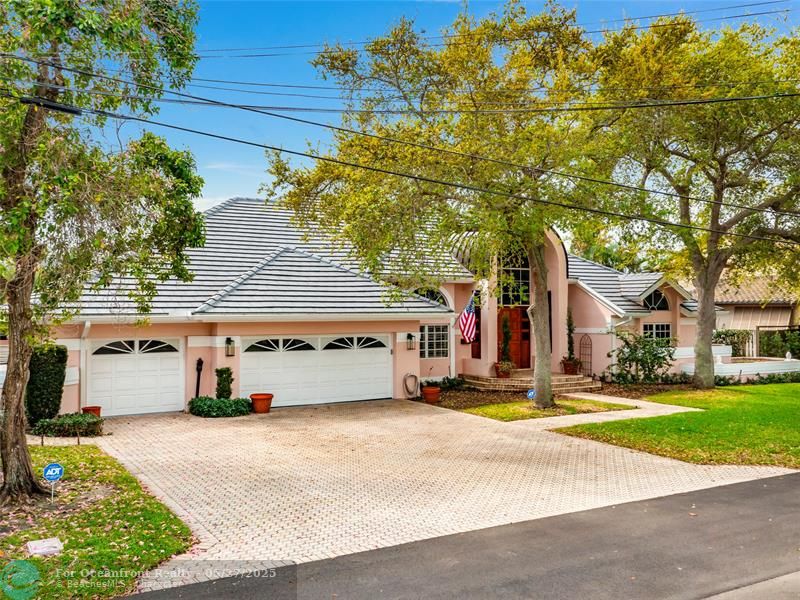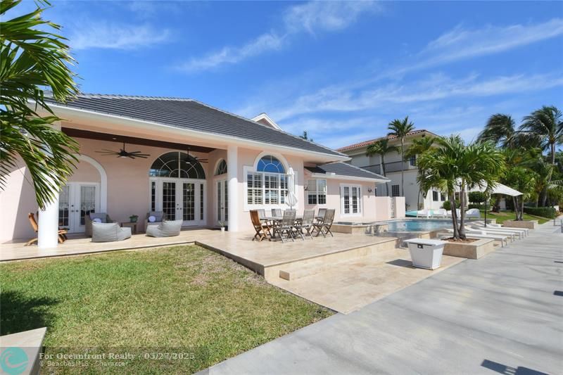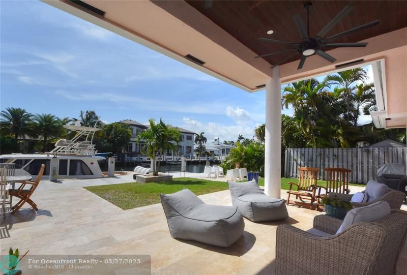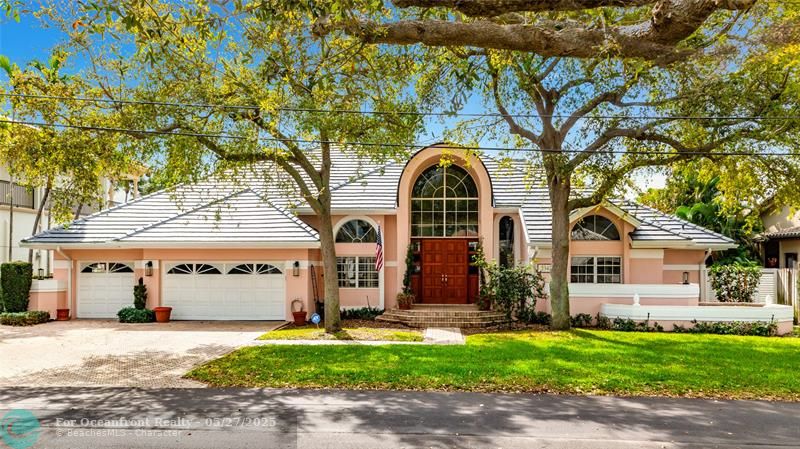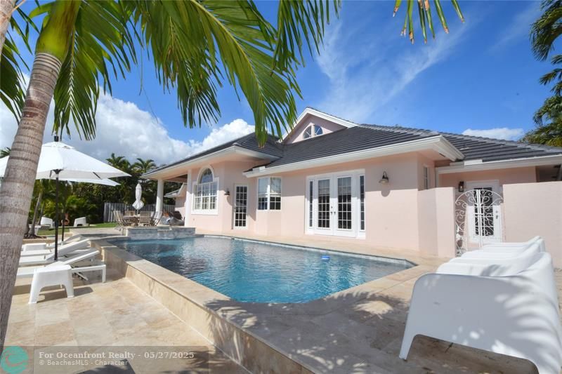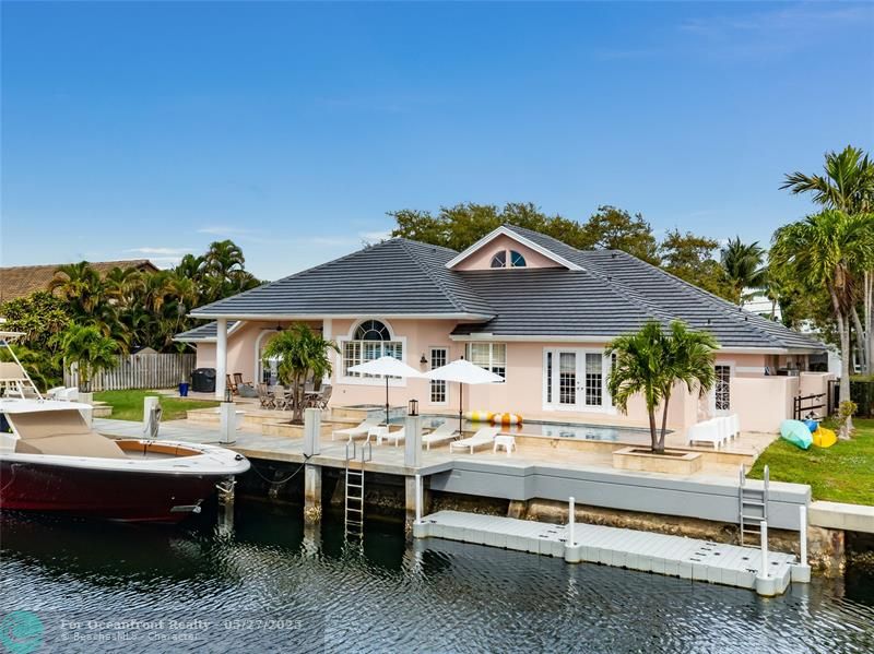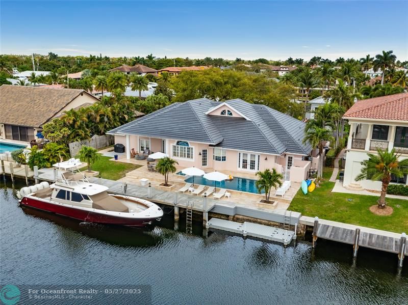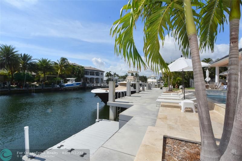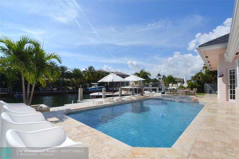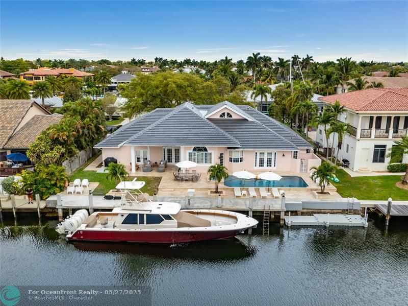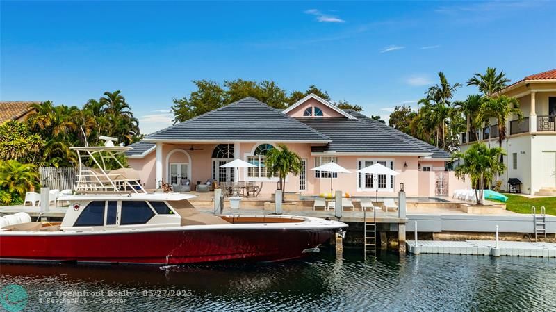 Boater’s paradise! This stunning one-story waterfront home offers 4 beds, 4.5 baths, and 3,300 sq ft of luxury living. A grand foyer, vaulted ceilings and an open-concept layout flow seamlessly to the outdoors. Boasting 100' feet of ocean-access frontage NEW concrete dock & sea-wall, 30' floating dock, and upgraded power—perfect for your yacht. Entertain by the resort-style Diamond Brite pool with travertine marble deck, wood paneled ceiling patio. The chef’s kitchen dazzles with Bosch & Sub-Zero appliances, island with bar seating, and sleek design. The spacious primary suite boasts custom built-ins, jetted tub, dual vanities, and a newly tiled cabana bath. Plus: 3-car garage and new tile roof (2024). Coastal luxury at its finest—bring your boat and live the dream!