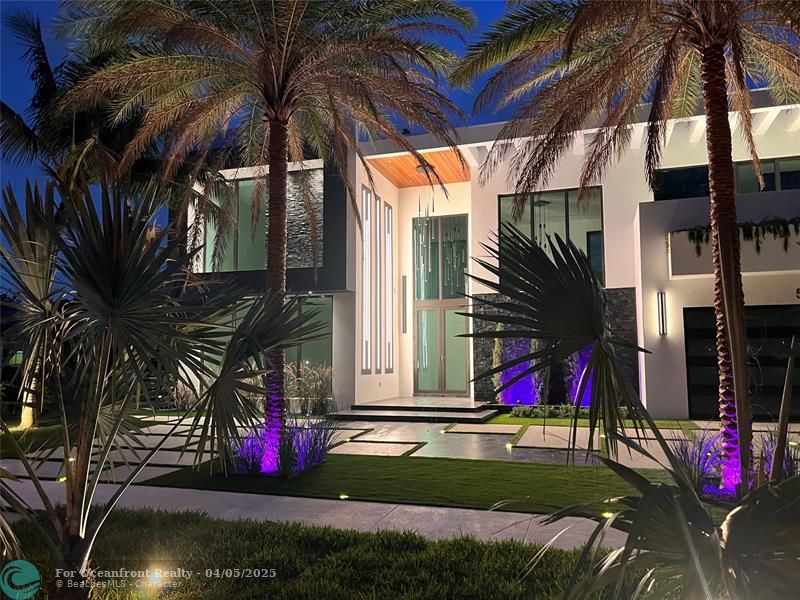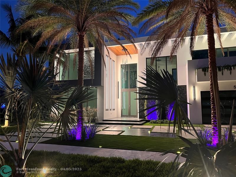 Whole home audio system & video surveillance with sleek illuminated accents on the polished concrete driveway.