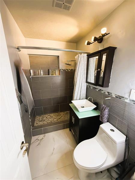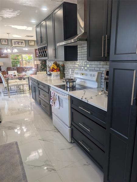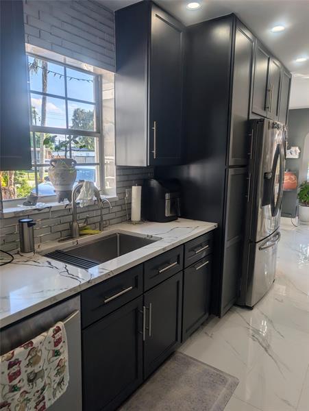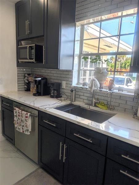 Stunning updated kitchen with quartz countertops, stainless steel refrigerator and dishwasher, a sleek cooking hood, soft-close cabinetry, and a large sink. Beautiful tile floor and large laundry room.