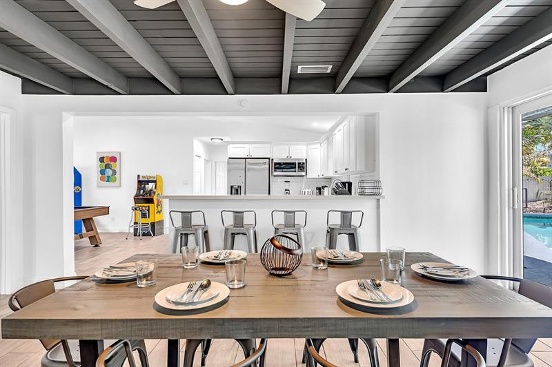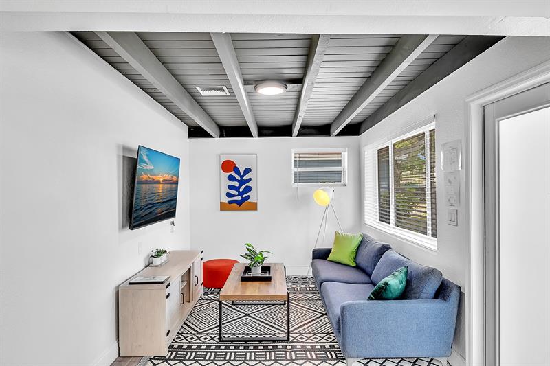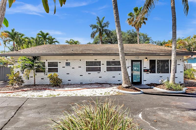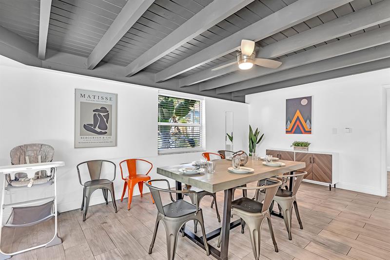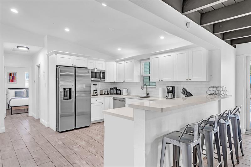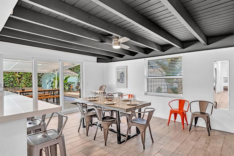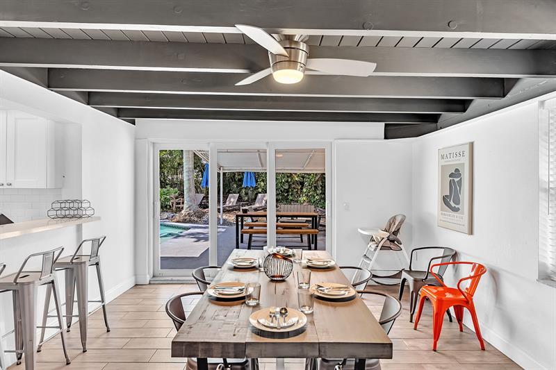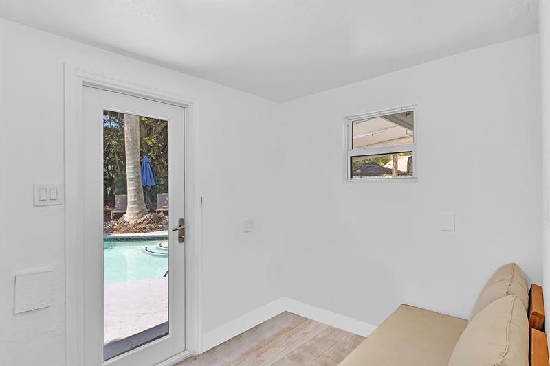 Welcome to tropical living in this beautifully updated East Fort Lauderdale home on an expansive 10,000+ sq. ft. double lot. The open layout features hurricane-impact windows and doors, recessed lighting, and stylish tile flooring throughout. The kitchen is enhanced with quartz countertops, stainless appliances, and custom cabinetry. Two flexible rooms offer options for a fourth bedroom, office, or guest suite. Step outside to a private fenced yard with vibrant landscaping, a solar-heated pool, and a covered patio perfect for relaxing or entertaining. Offered fully furnished and move-in ready—ideal for living, vacationing, or investment.