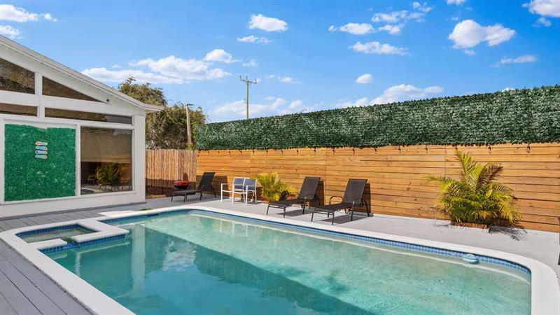 Turnkey, income-producing home in desirable Oakland Park. Contemporary 4BR/3BA layout with open design, volume ceilings, and abundant natural light. Features include a sunken living room, modern kitchen, spacious bedrooms, and updated baths. Private fenced yard with deck, pool, and spa—ideal for relaxing or entertaining. Recent upgrades include newer roof, A/C, pool finish/decking, and fencing. Circular drive provides ample parking. Pool dimension are estimate. All furnishings convey. Currently operated as a successful short-term rental with immediate income potential.