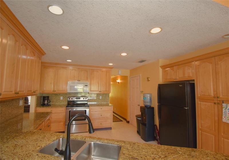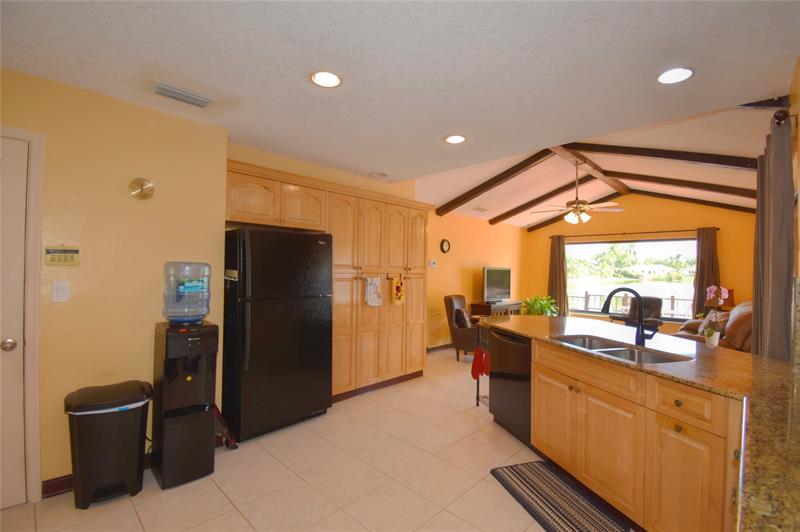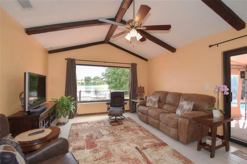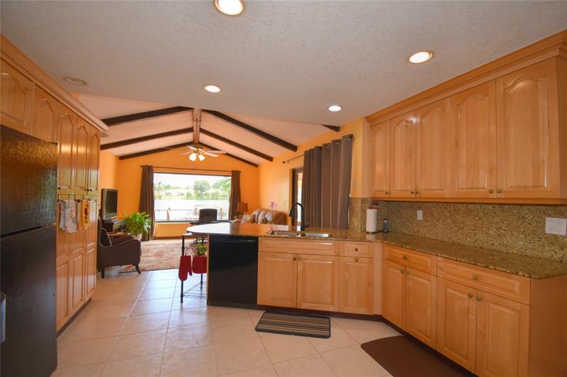 The heart of the home is the beautifully laid-out floor plan. The kitchen is appointed with wood cabinetry and granite countertops, offering a direct view of the family room, pool, and expansive lake beyond. The breathtaking views through the family room's picture window are truly an everyday luxury