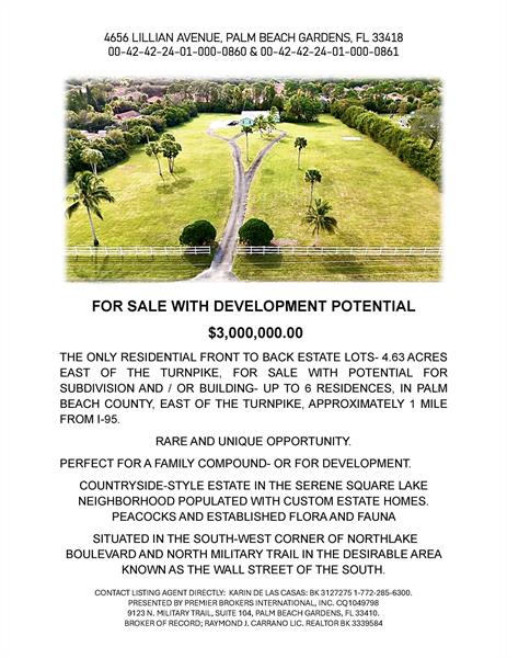 This home is situated on 4.63 Acres, the largest residential lot available in all of Palm Beach County East of the Florida Turnpike. With potential for subdividing up to 6 parcels, it's also ideal for a Family Compound. Located in the Palm Beach Gardens area coming to be known as: 'The Wall Street of the South', it's just one turn off the Northlake Boulevard and North Military Trail metropolitan area, to the serenity of the Square Lake neighborhood populated with peacocks, horses and custom estate homes. This 1972 home is structurally sound with a beautiful layout, in need of updating. The 4.63 acres consists of two nearly identical 2.31+ acre lots situated front to back onto Lillian Avenue.