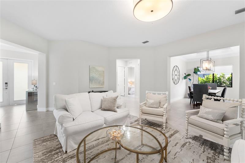 Rarely Available Turnkey One-Story Baron Model, 4 Full Beds, 3 Baths Dream Home w/3-Car Garage & Over 2,900 SqFt Under Living On A Corner Lot! Impact Windows & Doors, On Gas, Popular Tri-Split Floorplan, Chef’s Kitchen w/Quartz Counters & Stainless Steel Appliances, Built-In Fireplace In Living Room, Formal Dining Area Ideal, Spacious Patio Area w/Retractable Screen, Lush Landscaping w/Added Privacy, Huge Primary Bed w/Sitting Area, Walk-In Closets, Spacious Bath w/Separate Vanities, Shower, & Soaking Tub, Updated Light Fixtures & Window Treatments, Resort Style Amenities Including Access To 2 Clubhouses w/Heated Pools & Spas, Fitness Centers, Basketball Full Court, Tennis Courts, & So Much More! 24-Hour Guard Gates, A+ Schools, & Close To Parks & Recreation. HOA Includes Landscaping.