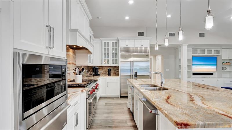 kitchen has a 6 burner Wolf range and a huge island and Sub Zero appliances. The grand foyer, stacked stone